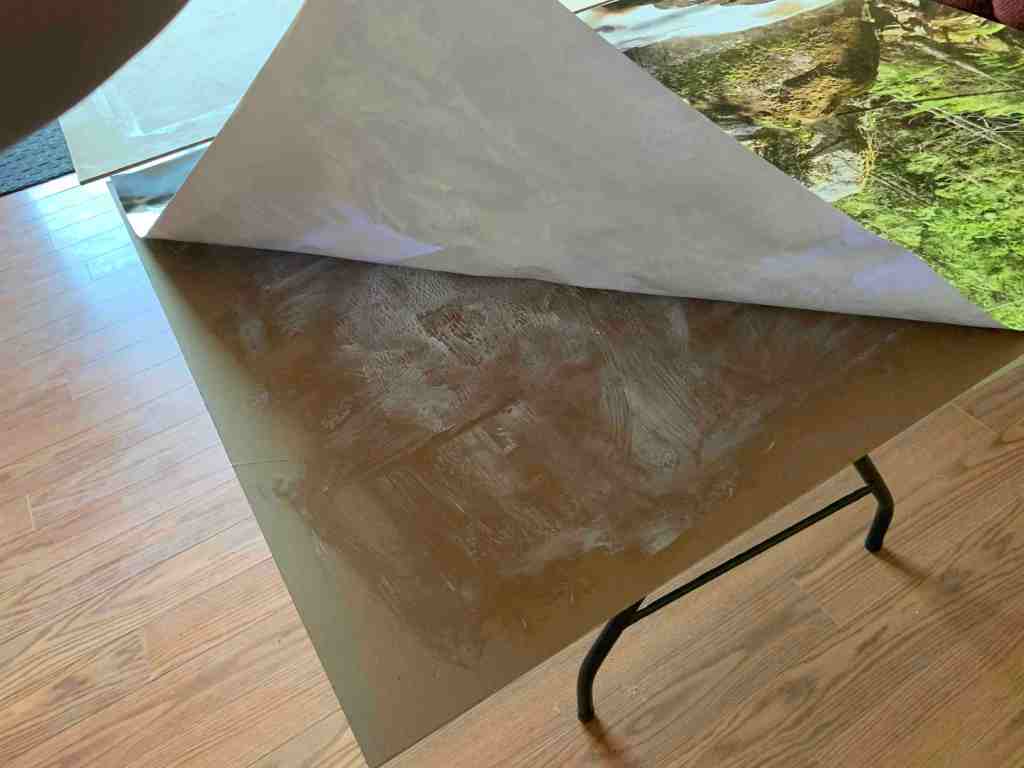 First thing I did was cut the MDF board down to the size that I needed to mount the picture. I ended up making the board 46″ x 34.5″. Once I had the board cut, it was time to mount the picture. I wasn’t planning on adding glass to keep the weight down, so I chose to mount the photo directly on the board. I didn’t have my dad’s fancy tack paper and heat press, so I went the route of the crafter and used modge podge. I spread a bunch out on the board as well as the back of the picture.