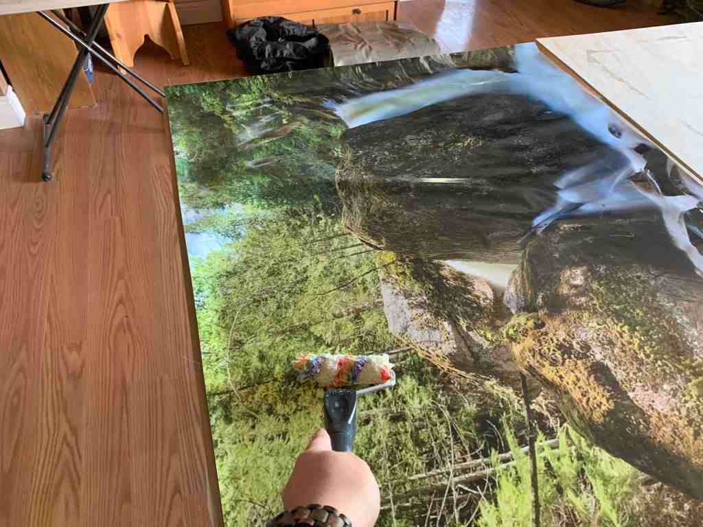 Once I had both all nice and tacky, I laid the picture down on top of the board. Now of course there was all sorts of air pockets, so I grabbed a small paint roller with micro-fibre roller on it, and used it to work from one end of the photo to the other, rolling the picture flat and getting any air bubbles out from beneath the photo. It worked great! I wanted to avoid getting modge podge on the actual photo, so I was careful along the edges, making sure to go to the edge but not roll back and forth over the edge. If they popped up slightly, it wouldn’t be a big deal because they were going to be pinned under the frame.