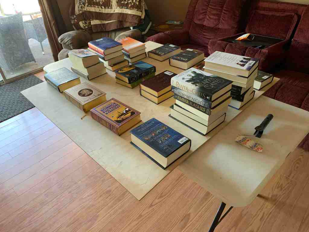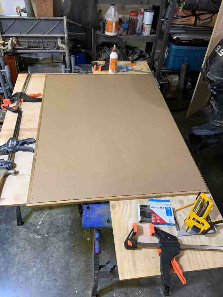 I then laid another piece of plywood on top and grabbed all my hardcover, heavy books to hold it all down flat. I let it cure for 24 hours to ensure a nice strong hold. It also gave me time to get the frame together.