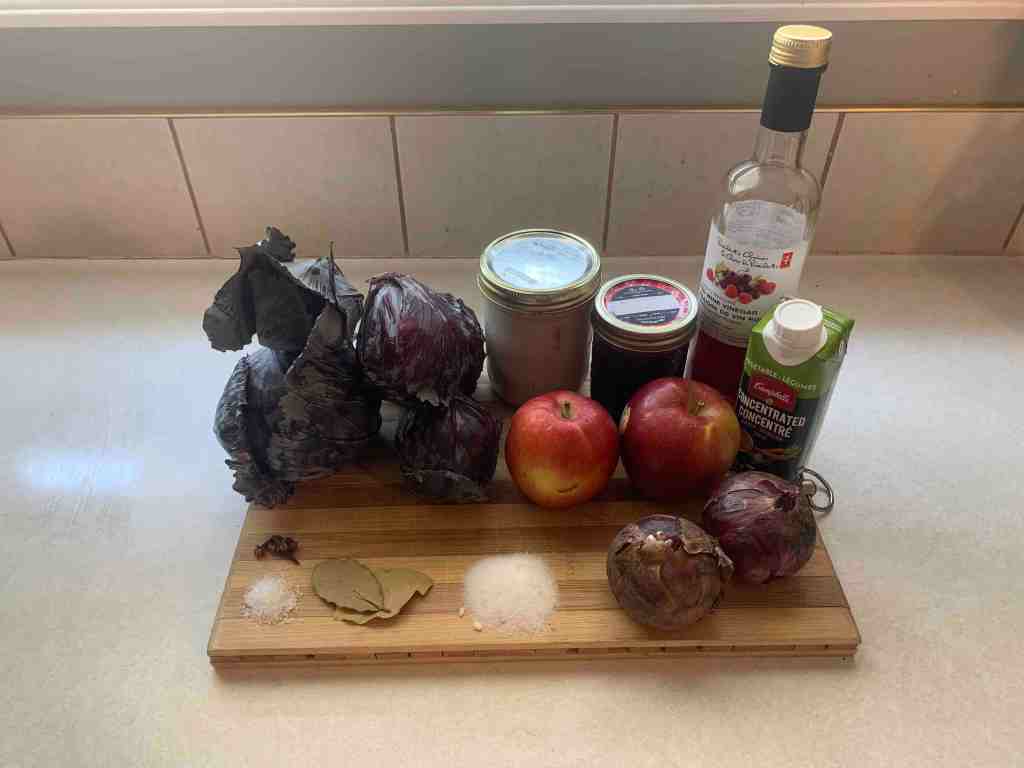 - Add the apple, broth, bay leaf, cloves, jam, red wine vinegar, sugar and salt.