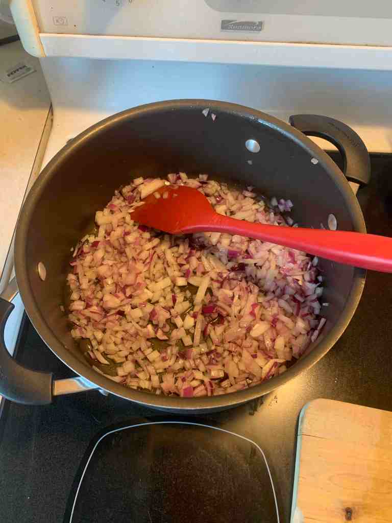- In a large soup pot of dutch oven, melt the butter over medium heat and cook the onions until translucent, approx. 7-10 minutes.
