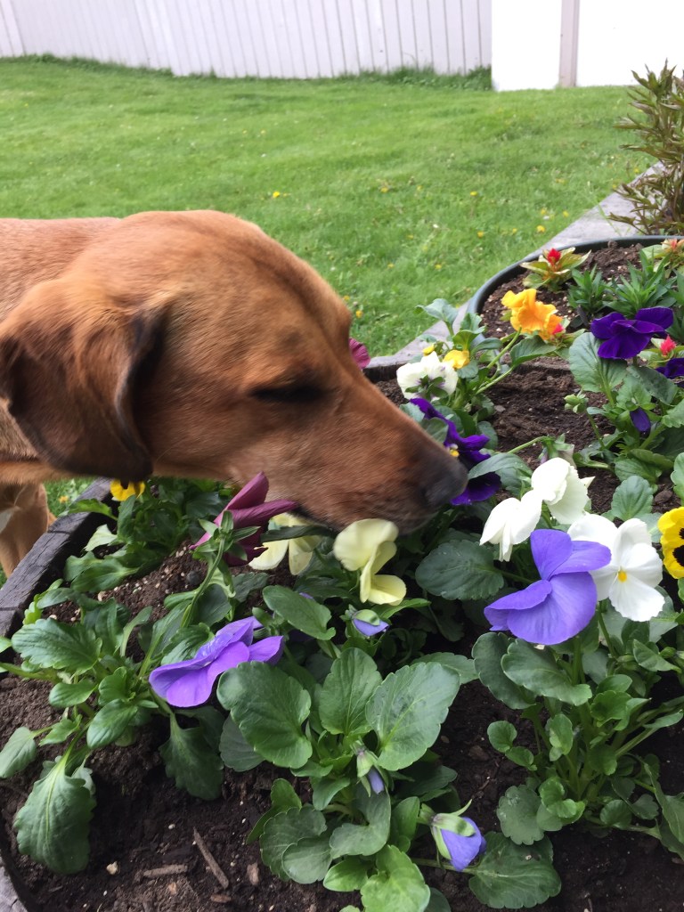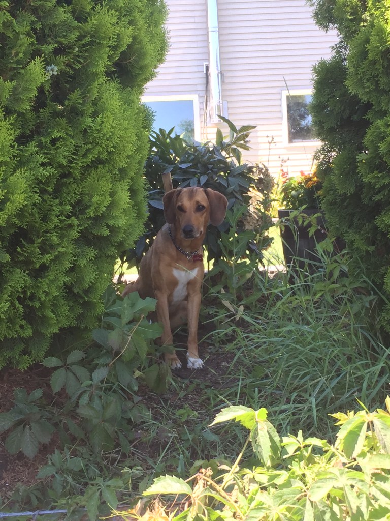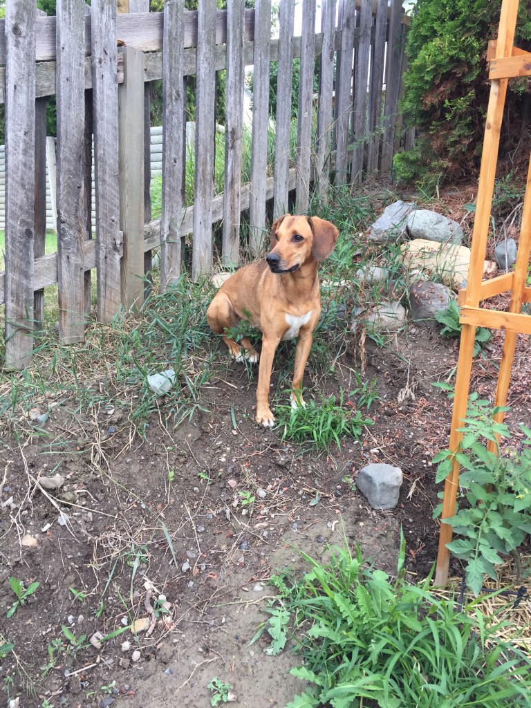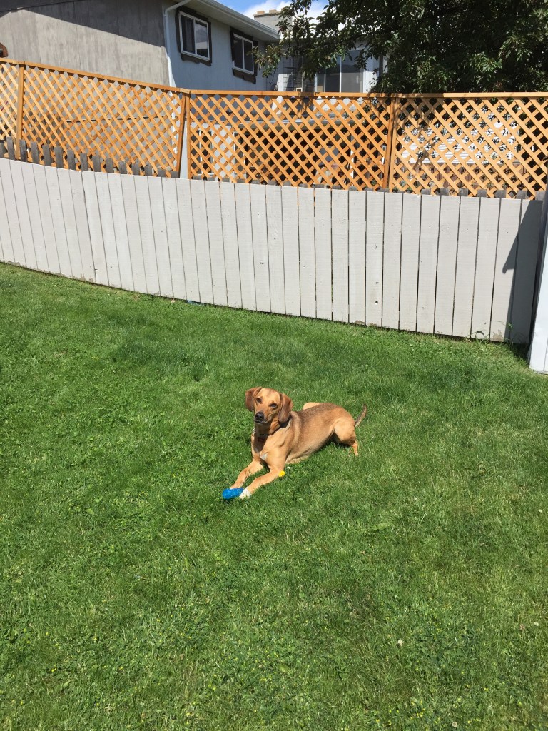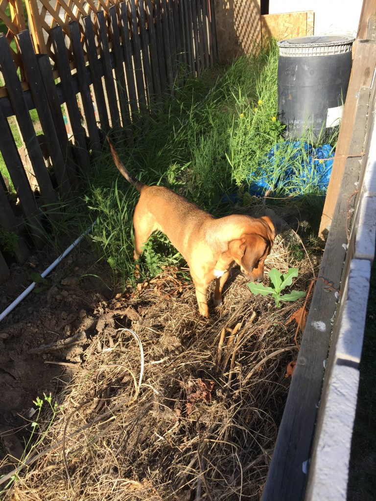When Kurt and I bought our house, one of the biggest appeals was the yard. Not only for the garden and oasis we are building up to, but also because we wanted Ellie to have a nice large space to spend time. She still got lots of walks, hikes and skiing in, but when we were home, she now had a place to explore on her own. There is a cedar tree next to the fence that Ellie gravitated towards. We call it Ellie’s office because she would often sit under the cedar tree and look out over the yard and the neighbours. We always joked she was a queen looking over her lands. She left her mark on that tree. It now has a nice hollowed area around the base that both her and Basil regularly use. She also enjoyed a dirt pile that was created when we first cleared the yard. It allowed her to get high enough to look over the fences at our neighbours. If we were down in the bottom of the yard, she would often be down there, perched on the miniature hill, looking over the fences.