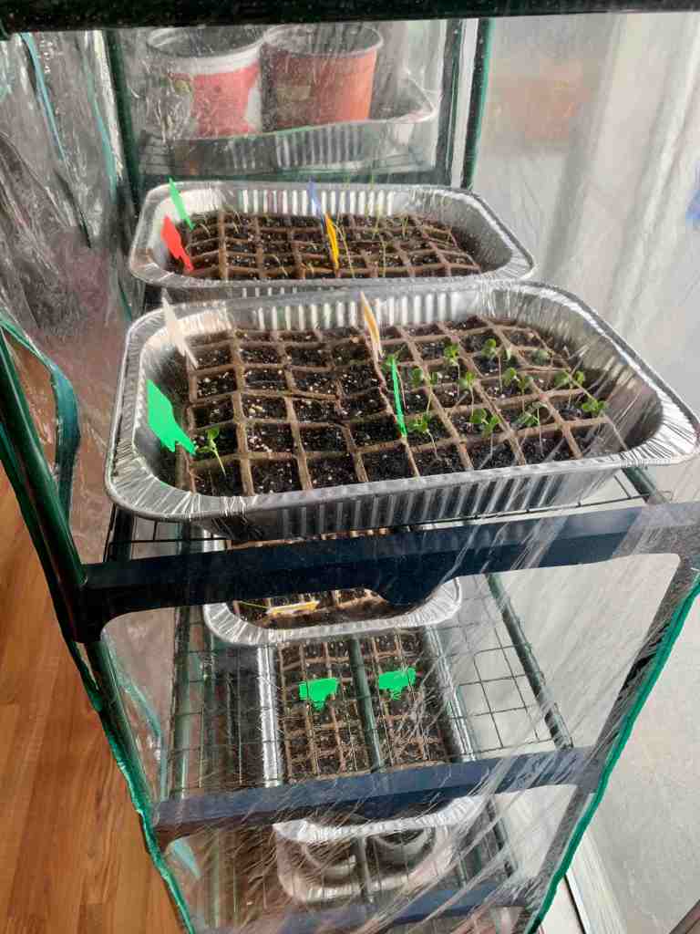 The tomatoes are mostly looking happy and growing like weeds. Though our sweetie pie cherry tomatoes only just made an appearance. Looking back at last years spreadsheet, they did take a little longer than the Big Beef and the Romas. I may end up moving all the tomatoes into one of the greenhouses, so that I can put a small fan in there on the lowest setting for parts of the day. I don’t want them to get as leggy as some of them did last year. Figure I will start the breeze on them early to force them to grow strong while they grow tall.