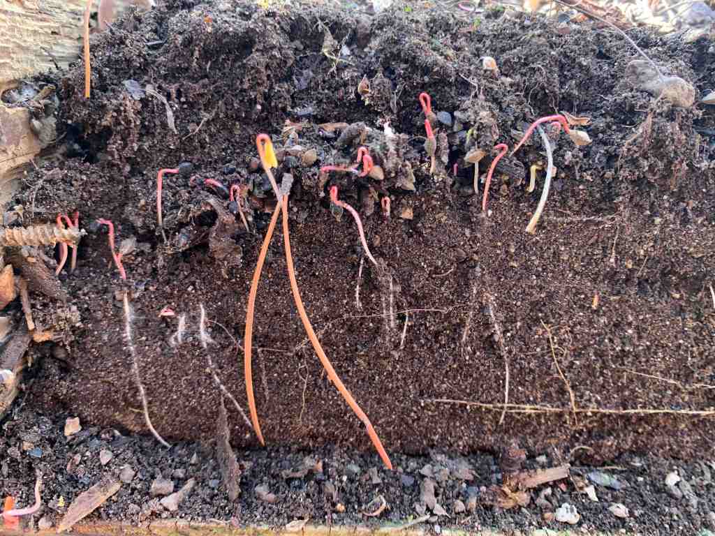 It’s always fun finding funky little visuals in the garden. As we pulled the tower apart, we found some cross-section of weeds growing up through the soil. We also found a little ball of partially frozen worms, just starting to thaw out for another summer of helping our garden. We made sure to put them into a new, warm, home over by the asparagus and garlic. And we found some of the bottom soil that was still frozen, had taken on the pattern of the landscaping fabric.