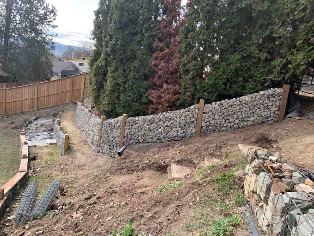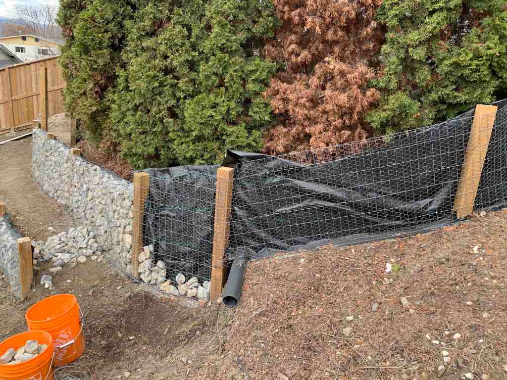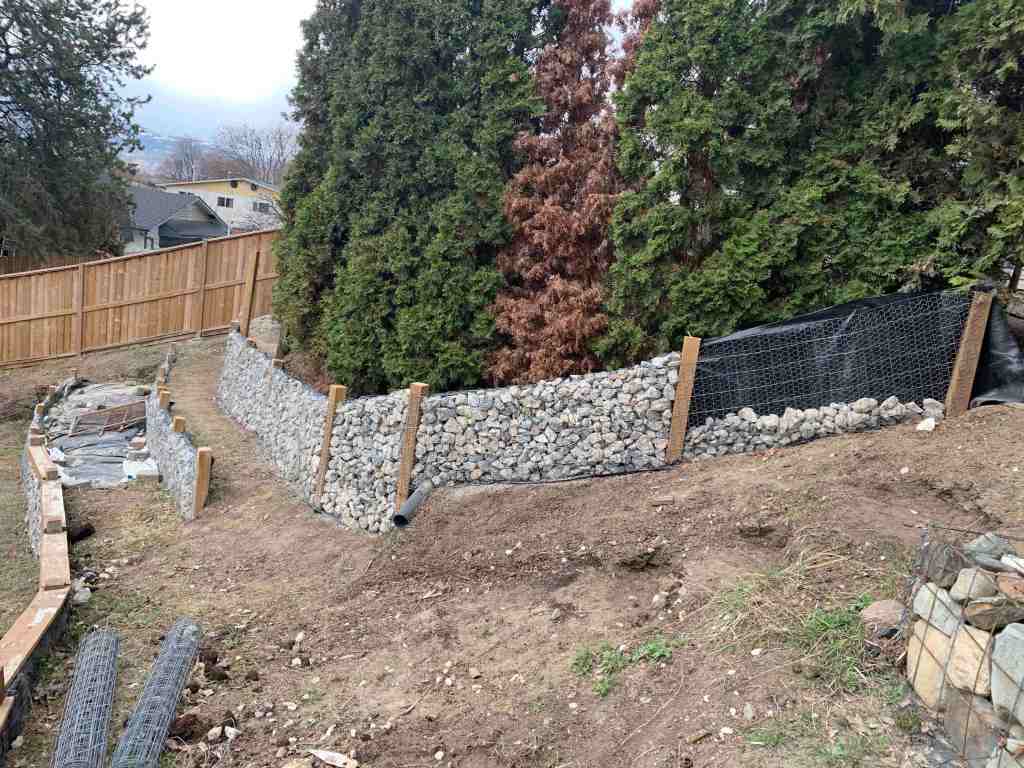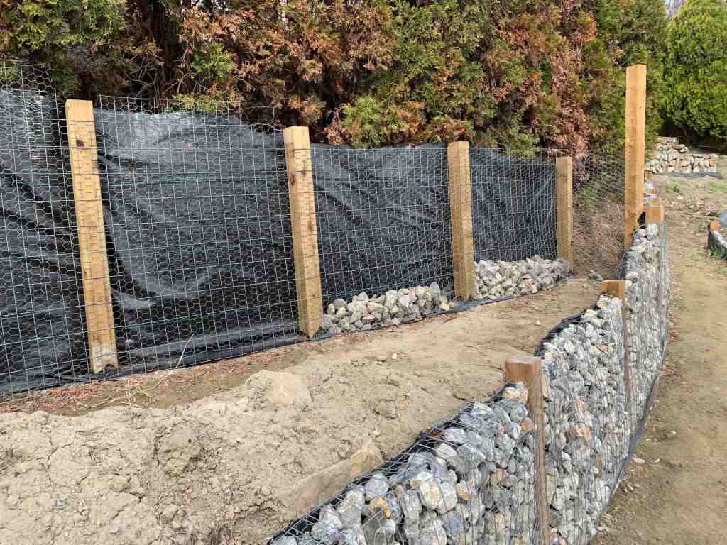 I did get motivated to start the walls on a sunny April 3, but only managed to fill 1 section by myself. It has been a while since we have had to fill sections of wall on a slope, and I forgot how much the legs, hips and lower back start burning from standing on an angle for a long period of time. All the walls we have done recently, has had nice flat paths in front of them to stand on.