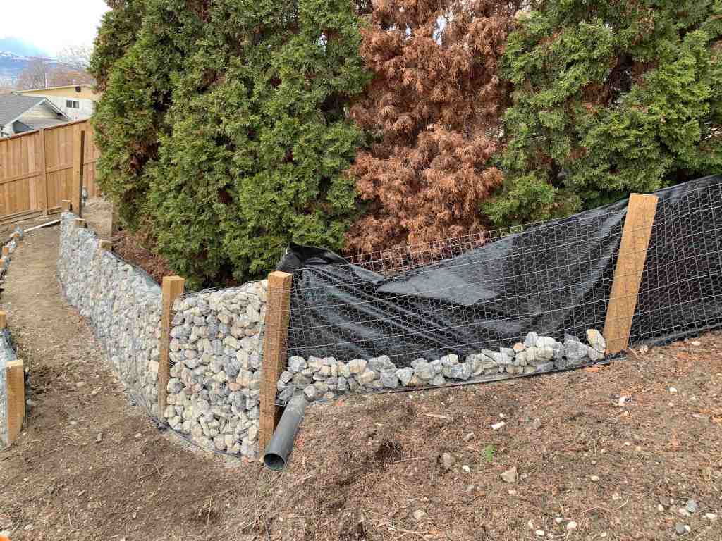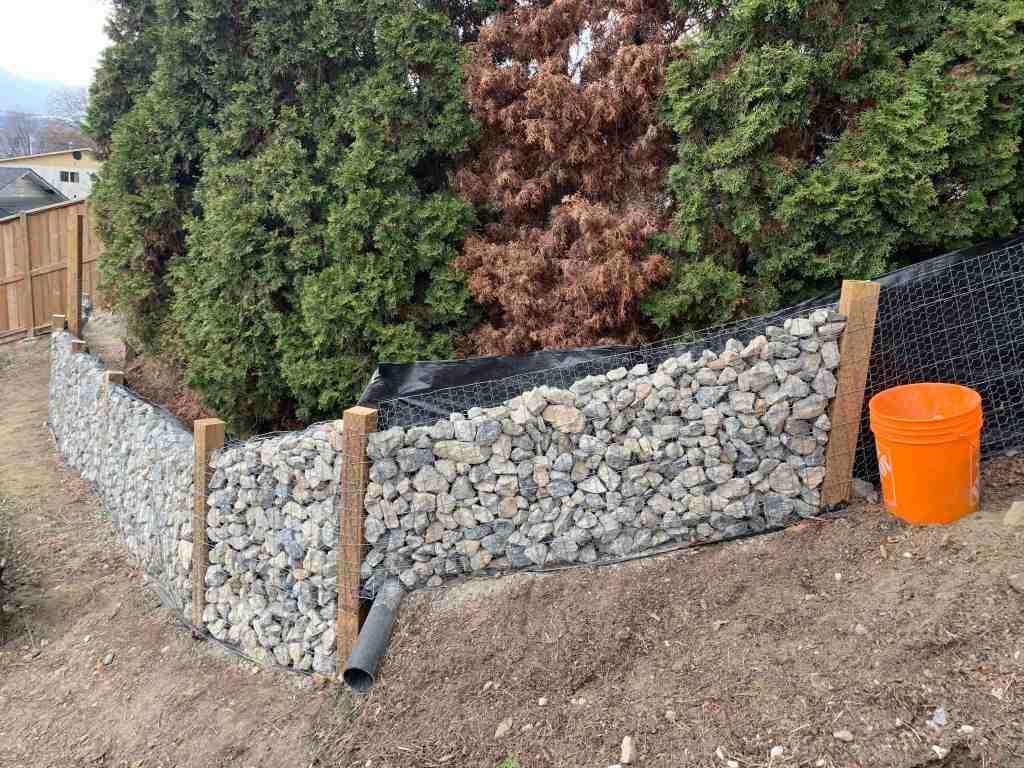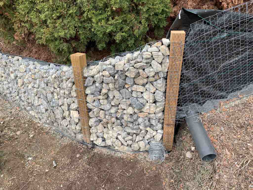 Since we are taking the rocks down in buckets, I realized it would be a much easier process with Kurt because we could just dump the buckets of rock into the walls while the other held the wire open. Then we could just shuffle the rocks as needed to ensure there were no big holes or gaps in the rocks.