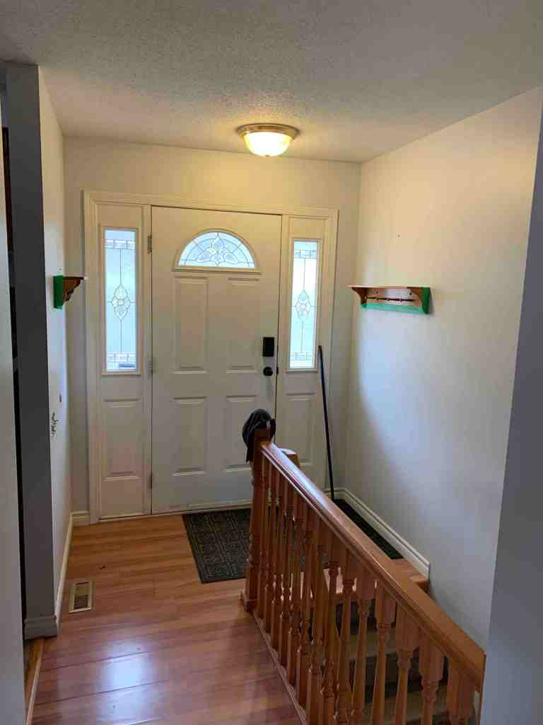 The people who owned the house before us had just finished updating the house, so when we moved in, there wasn’t really any need to do any updates. Instead we focussed on the outside. However, over the years, I realized that I didn’t love the colour of the living spaces. It was done in a split paint with a white trim border splitting the 2. The top was a light colour and the bottom was darker. In different lights it ranged from grey to green and sometimes blue. When our electric wall fireplace bit the dust last fall, and I had to take it off the wall, it was clearly time to update the paint and fill the holes that were left behind.