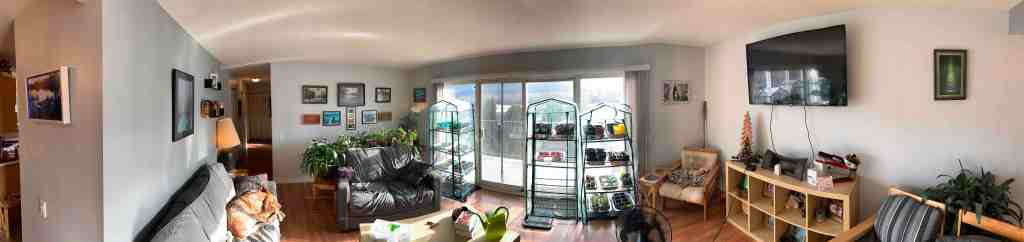 All-in-all, I am really happy with the colour. At first I was a little annoyed because the light grey does definitely have a blue tinge in certain lights despite not having any blue in it. Perhaps there is something about our living room patio weekend that gives the room a blue hue regardless of the paint colour. Either way, this is what it will be for the next 10 years, and I like it. Especially the solid colour walls instead of the 2-tone walls.