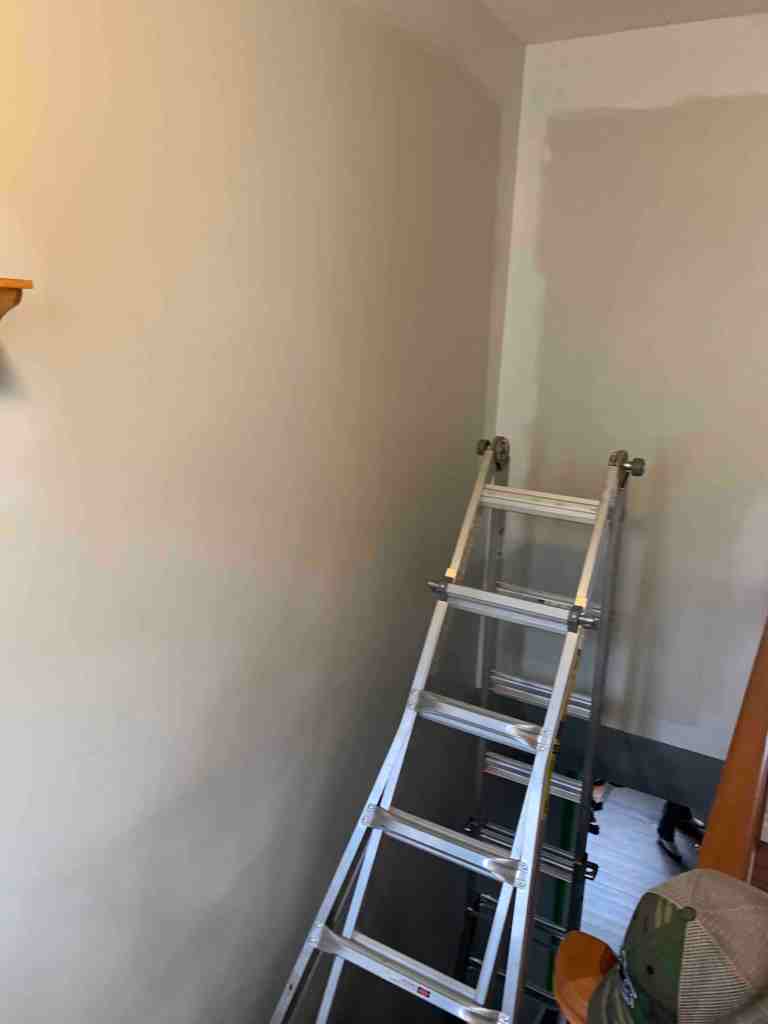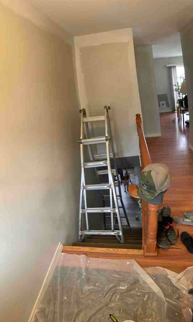 While I was doing the trim, Kurt took a break from his project to come and help start rolling the walls. He managed to get the living room main wall that connects to the dining room, and the whole dining room done. Then he decided to go back to his projects. I also had a couple extra days off, while he had to go back to work, so he also wanted a little down time to relax, which is fair considering how much we accomplished over the weekend. Though he did help me with the stairs and our stair ladder. So happy we have this ladder! The ceiling trim around the stairwell would have been near impossible without it.