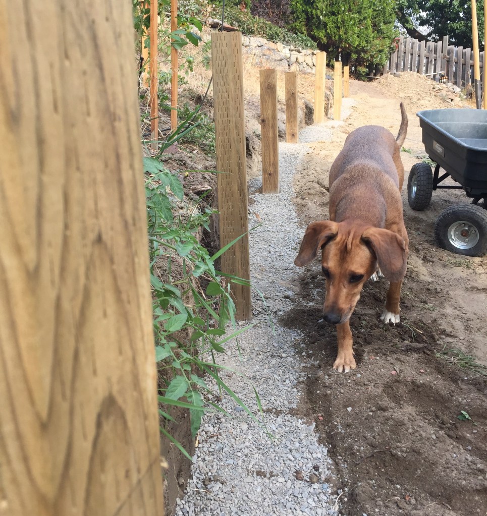 Kurt becomes the human bulldozer and pushes in our main path which was the starting point for our rock walls. We completed the first large section of wall that goes from one end of our yard to the other, following the upper side of our path.