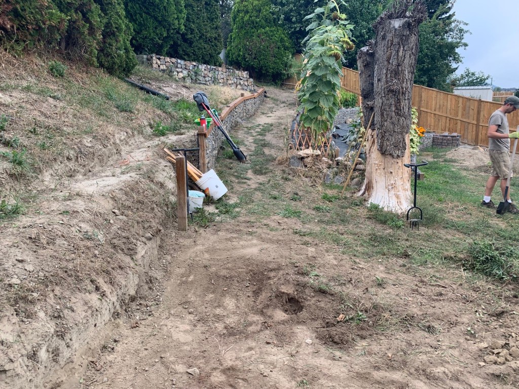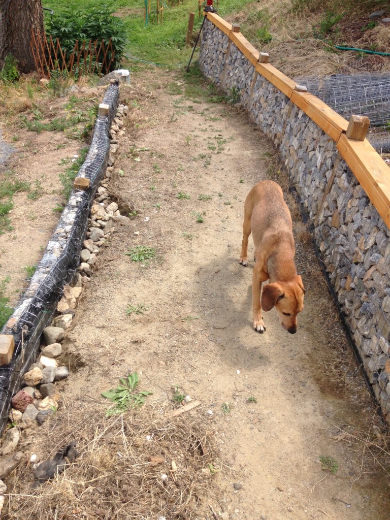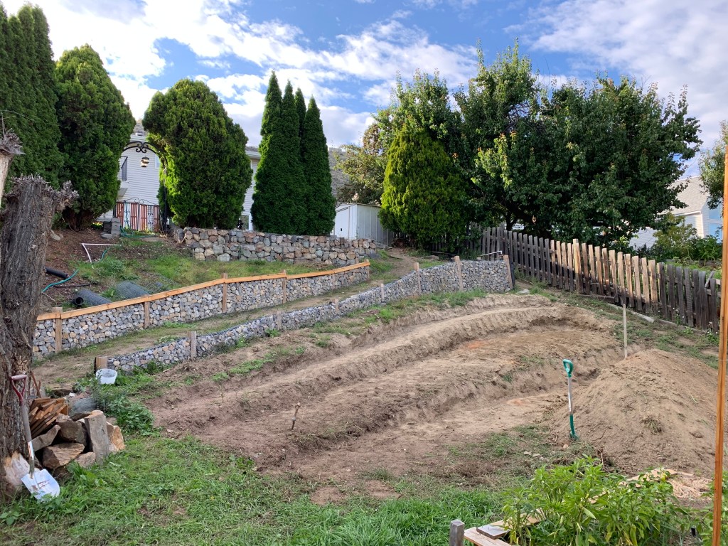 We procrastinate about rock walls by re-doing our back gardens with some of the rock that is meant for our rock walls. We eventually get it together and fill the lower path wall. Kurt becomes a human bulldozer again and starts digging in the next tiers that will be our garden beds. By the end of summer he has all the tiers dug in and ready for more rock walls.