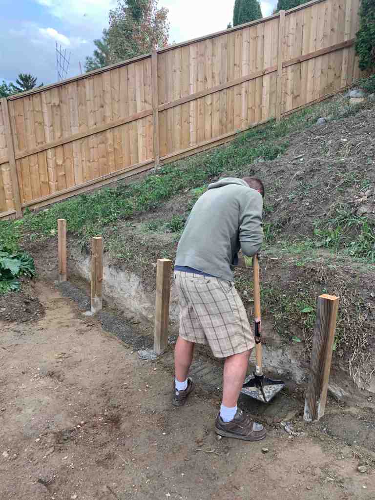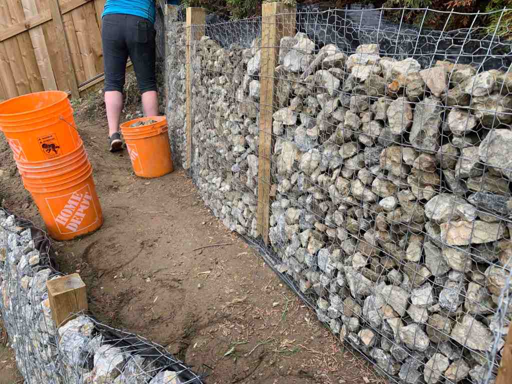 We finish filling the upper side of the path walls. We get the lower side of our path wall built and ready to fill with rocks.