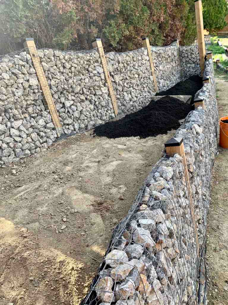 - Fill the top bed with beautiful growing soil. 8-14″ deep depending on which side you are measuring and the angle of the wall on the side-slope.