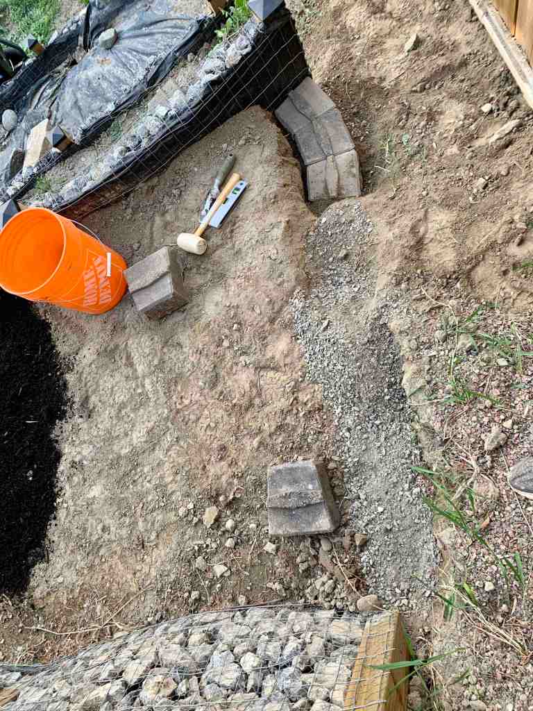 As you can see, the list wasn’t short. So earlier this week, we got moving after work, and started on the stackstone wall that was going to cap our top bed. We’ve built a few of these now, but sometimes wrapping our heads around how it will work takes a minute. Luckily, we had walls on the other side of the yard to look at and remind ourselves of what we needed to do. We at least remembered to start at the lowest point and work our way up…a mistake we had previously made with a past stackstone wall.