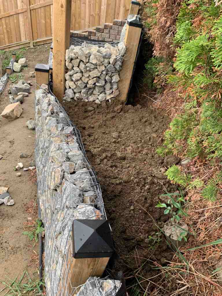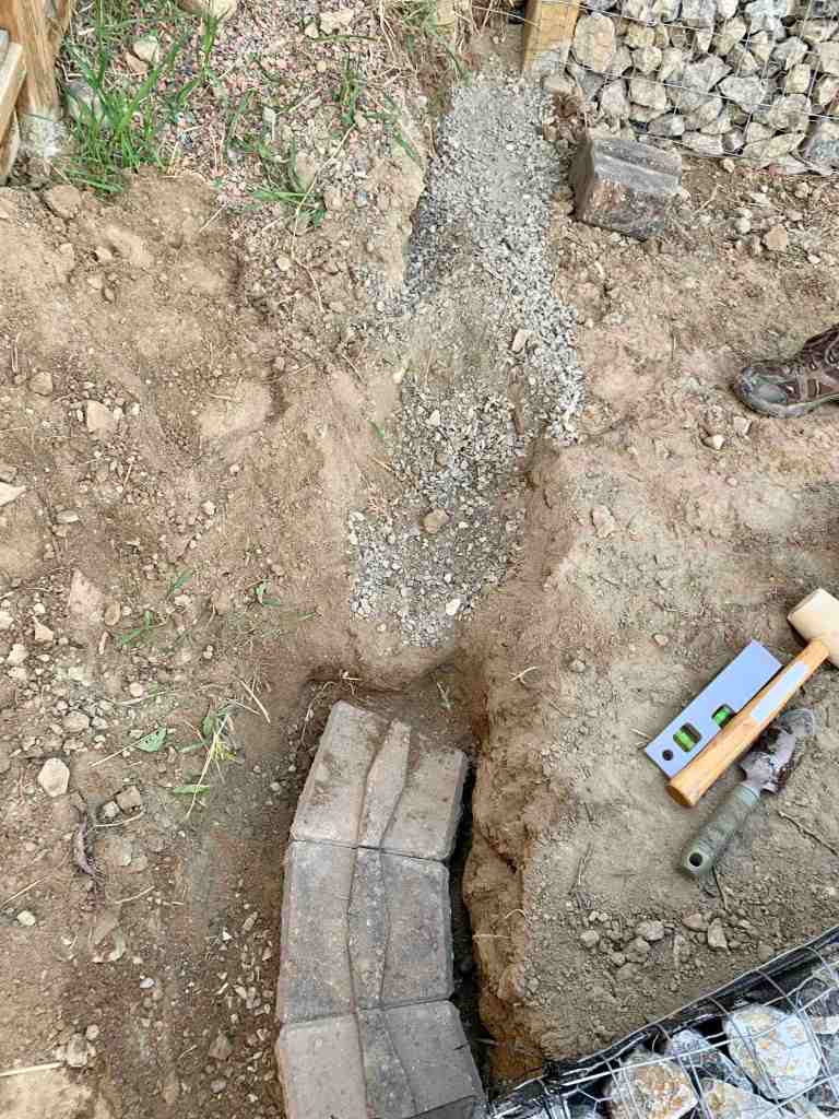 When we built this wall, we had backfilled behind it, but hadn’t really tamped it down, so the soil had been pretty loose. With the melt and rain, some of the areas had sunk down pretty good and required some better backfilling and tamping to make sure it wouldn’t sink again. We noticed that the grate in front of our shop empties just above this bed and the water naturally travels along the wall. We do have a plan for this issue, but that is a future post.