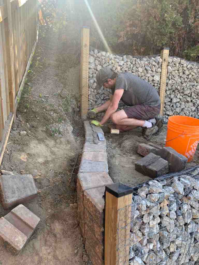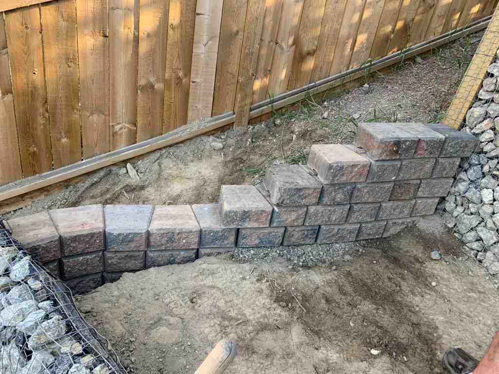 The challenge with being amateur landscapers is that we don’t always think of everything that a professional landscaper would. For example, when we were cementing in the posts for the walls, we made sure that the end post on all the walls lined up because we knew that we were going to be adding stackstone end walls. What we didn’t think of is which walls would actually have the stackstone walls between them, and thus, making sure the posts were angled properly. Instead, we made sure that the bottom three were angled the same, and the top one is different. What is the problem with that you ask? Well, the stackstone wall doesn’t end up meeting up with the posts well and leaves a big ugly gap.