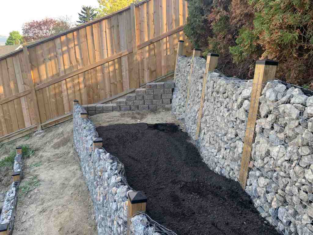 - Turn and level the soil in the bottom bed. Backfill behind the wall where it was loose and has sunk down.
