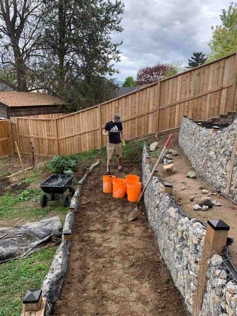 Once we got all the unwanted soil out, we started filling buckets with the composted soil and worked to fill that top bed. Our cart doesn’t go to that level, so the best way to fill it was carrying big buckets of soil. Who needs a gym pass when you have a large garden?! We definitely felt like we had gotten a workout doing all that soil hauling.
