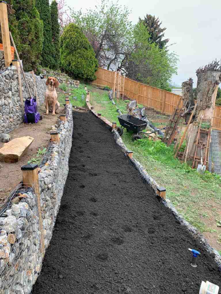 Kurt had grabbed another scoop of soil on his way home from work on Friday, knowing that we were going to work on filling the bottom bed with soil. After filling as much as we could with the soil he had grabbed, we took a little break to run to the landscaping store to grab another scoop of soil and a quick breakfast. We had thought it would take a few scoops to fill that long bed. Once home, we grabbed our trusty yard cart, filled it up and started making trips to the bottom of the yard to fill the bottom bed. Hauling soil down the yard is way better than hauling rocks. Both Kurt and I mentioned how much more we were enjoying this work over building the rock walls. It was nice to have new tasks to work on. We got the bed filled in nicely. Basil thought it looked so nice and fresh, that she just had to take a gander through it. So very proud of herself for enjoying the fresh soil between her toes.