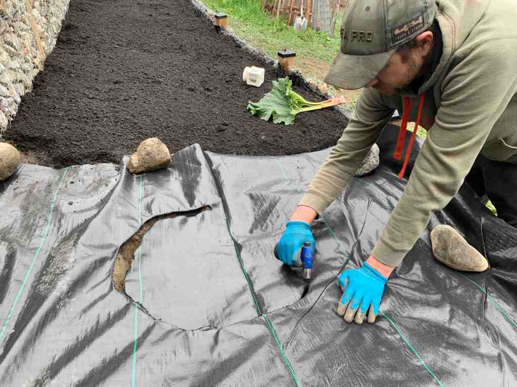 So, Kurt went and grabbed his torch and did a test run on a scrap piece. It worked like a hot-damn! So back down to the bottom bed we went with the torch in hand. Kurt had already dug out a hole for the rhubarb, and found it easy to follow the edge of it while he torch-cut a hole the same size. It was awesome and much less finicky than scissors.