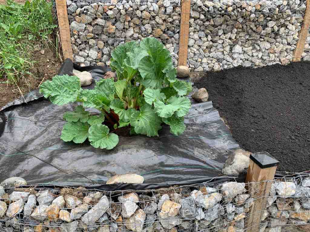 I did a harvest of some of the larger stalks and leaves to make it a little easier to manage. Plus, Kurt had mentioned he would really like a rhubarb and apple crumble, so I had plans to use it all. As I was cutting around it’s base, doing my best to not break too many of the roots, I realized that after harvesting, the plant was going to be much smaller. Kurt also saw that and suggested that we put down landscaping fabric and just cut a lightly larger hole. The nice thing about rhubarb is that it’s foliage is so thick that weeds don’t generally grow around the base or a bit of a perimeter around the base because the large leaves don’t really allow for anything else to successfully grow.