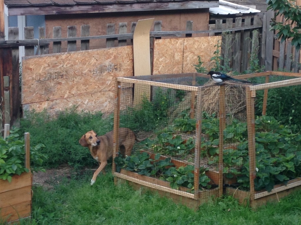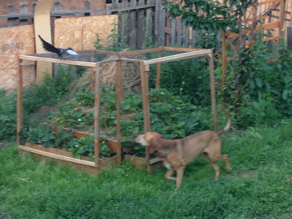 So far it has been doing a much better job then Basil at keeping all the birds out of the strawberries. Now we get to enjoy them as they ripen, rather than take the few that the birds missed. It’s sad that Ellie isn’t here to pose with it, and Basil was too busy sunning herself in the dirt-pile to make an appearance for a photo opportunity. The berries are once again protected.