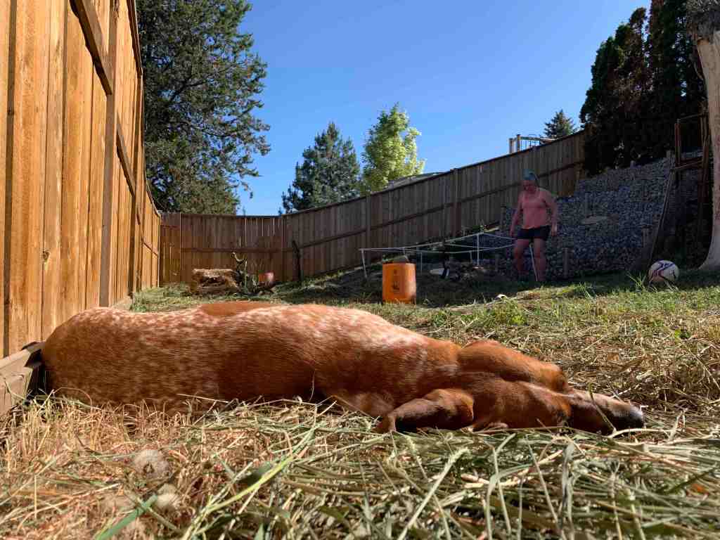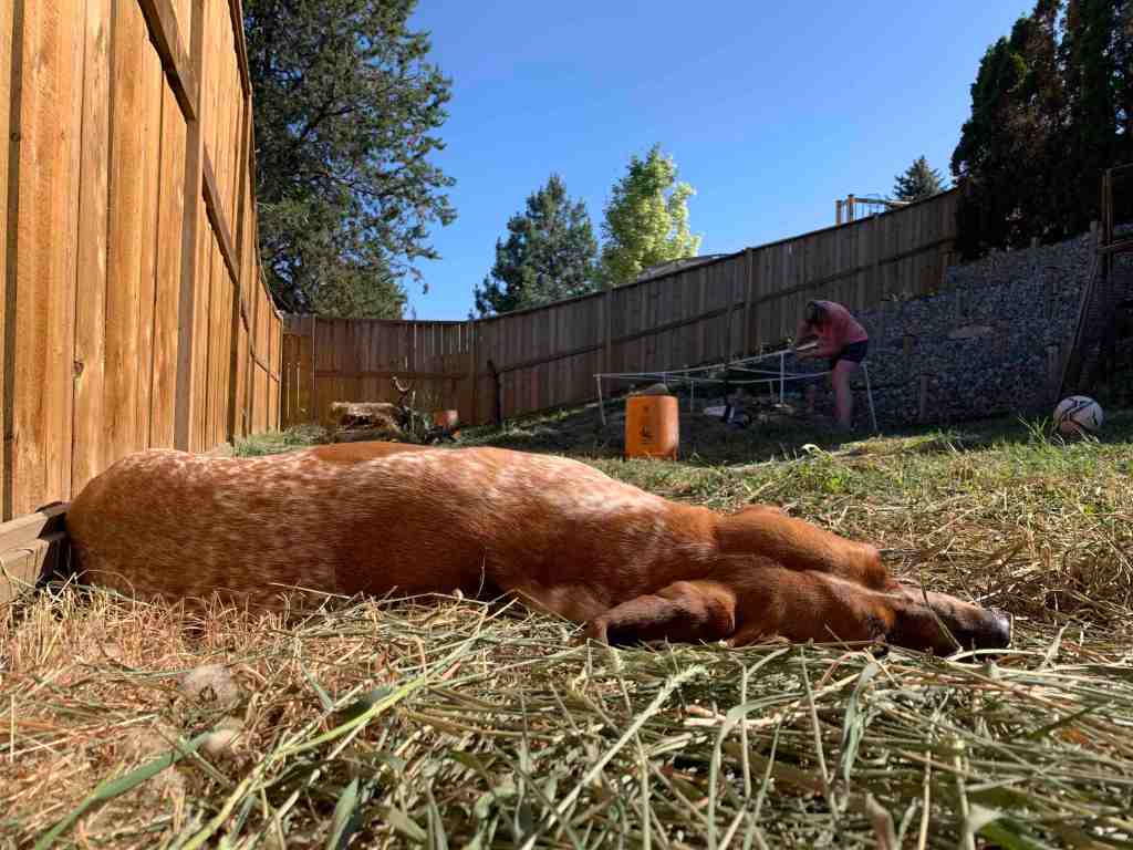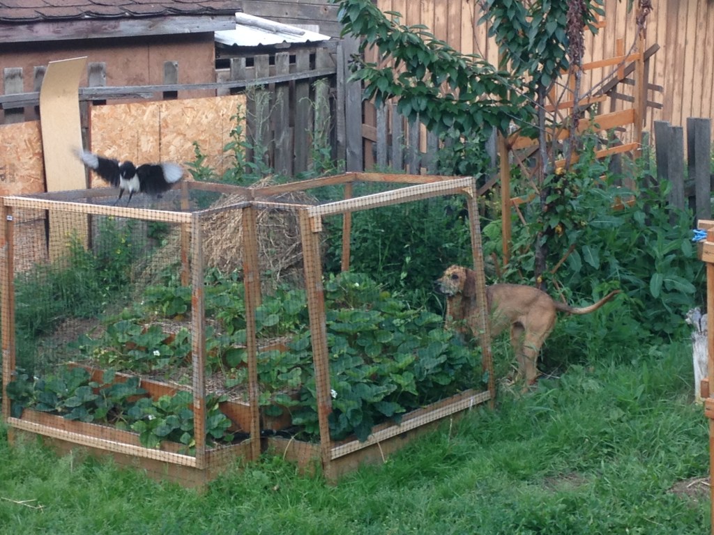 I tell this story because we have had to build a netted force-field over our strawberries to keep the birds out. Our original one on the tower was meant to be temporary and lasted 4 years (see “Protecting the berries” post). At that time, Ellie was very helpful in keeping the birds at bay while we built it. We even shared a story of Ellie vs. the Magpie on the blog due to a funny little encounter at the strawberry tower and cage just after we built it. This experience has been different due to Basil’s friendship with all the birds. Good for birdwatching, bad for the garden. If you look closely at the pictures below, you will notice that I am building the strawberry cage in the background. Lazy hound.