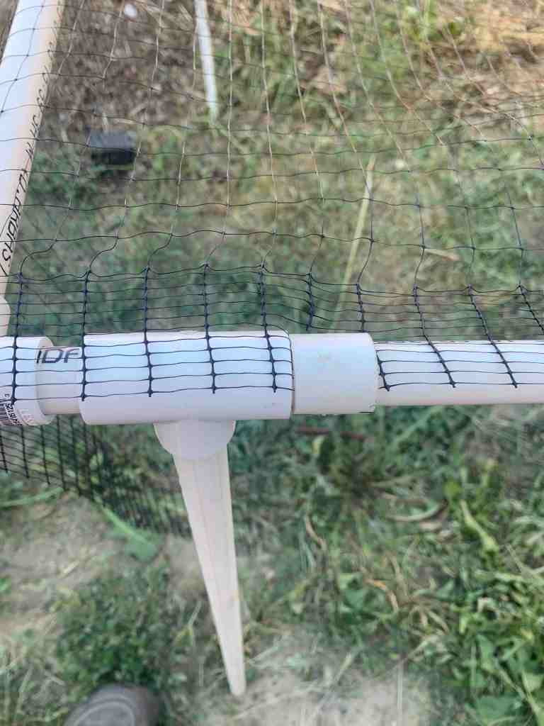 The next conundrum was the netting and how we were going to attach it to the PVC. Originally, we thought we would just zap strap it into place, which would have worked fine. We also thought of weaving twine through it, but it seemed time consuming and if we needed to change the netting, time consuming again to take it all off. While pondering, we were standing where the old strawberry tower was, and I remembered a makeshift “PVC Bandaid” I had made for the irrigation when Kurt had accidentally nicked it with the weed whacker. I had used the flared end of one of the PVC pipes, and cut a section out so that it could snap on top of the other pipe. I figured since the regular pipe was supposed to slide into the flared part to connect them, then why couldn’t I use it to glue up the hole. Worked like a charm. So I used the same theory again, this time without the glue.