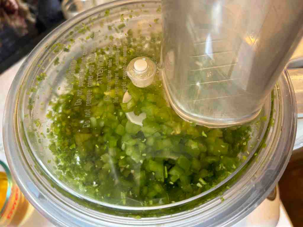 - Ground all of the above until you have a fine chop on all items. Little chunks for floating in the jelly.