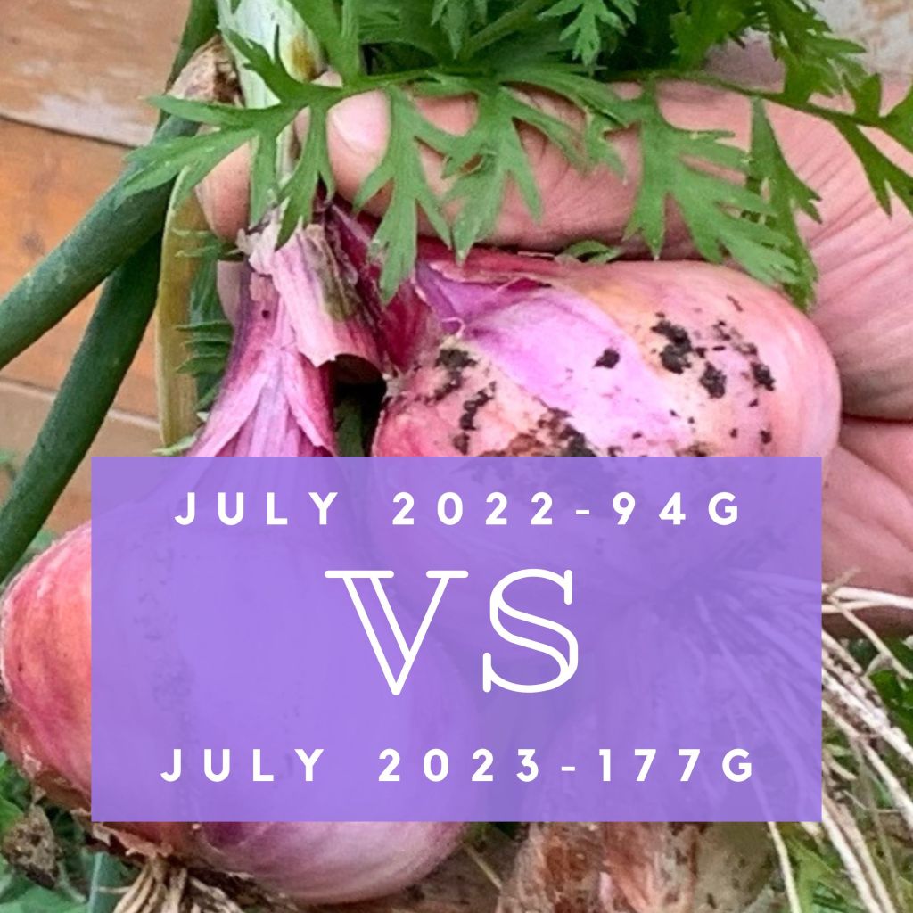 We didn’t do garlic last year, so this is the first year for recording. It was an ok year. We had a great time with the Garlic scapes and enjoying the first harvest that you get from garlic plants, but we still have a lot to learn.