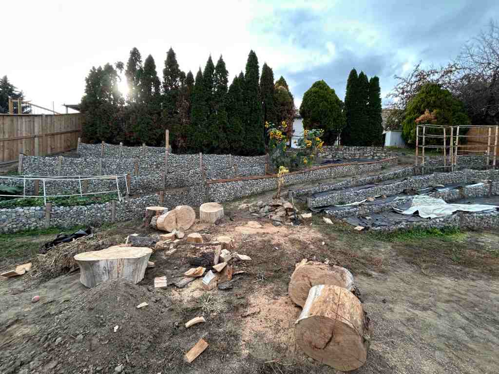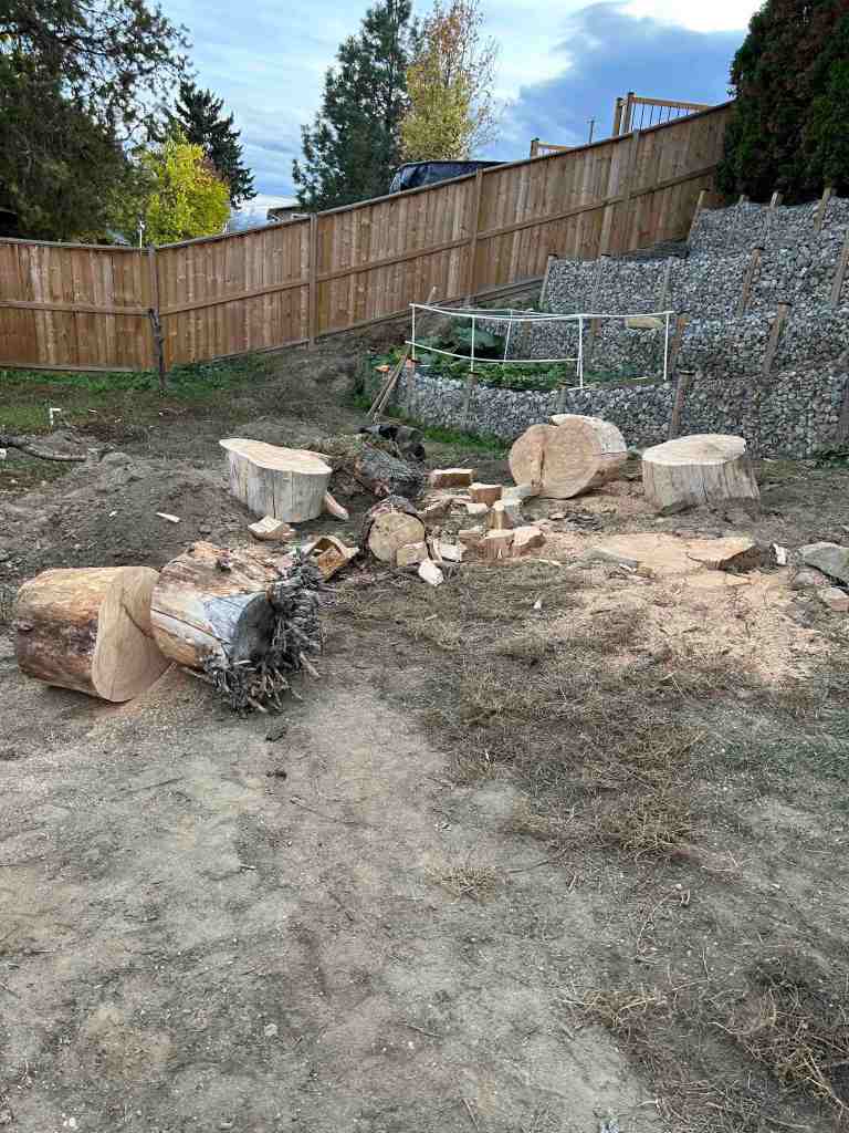 Overall, it is great to have the stump gone. The yard feels much larger without it there. It got cut down yesterday, and when Kurt and I were blowing out the lines this morning, we both noticed how much larger the back feels now. The only task other than cleanup of the logs is to get the stump out. I am going to go and talk with some garden centres about the best option. Ideally, we will drill holes into the stump and pour something in, but we want to make sure it is non-toxic for Basil, as well as our garden. We will get that done before it gets too cold, so that it will hopefully start the rotting process this fall and through the winter into spring. It’s not the end of the world if it isn’t rotted by spring, but it would make landscaping the bottom much easier if it was gone.