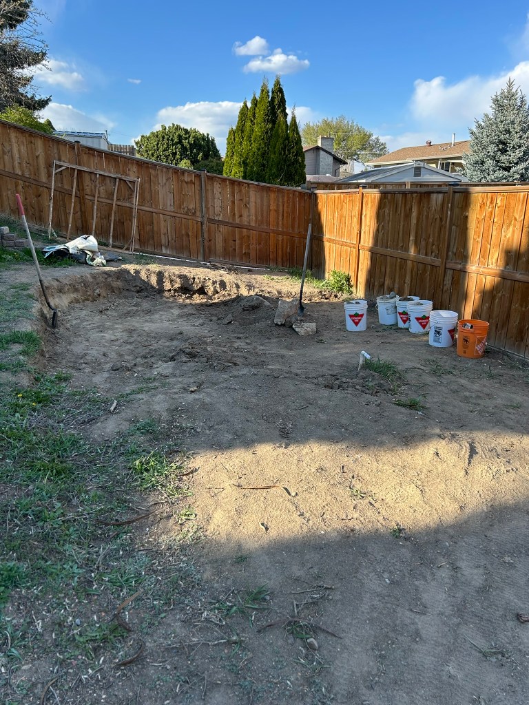 Because we never considered a pool, we didn’t worry too much about making sure that our bottom garden wall was completely level with the fence. We were okay with a bit of an angled yard since we had only planned on doing a micro-clover & grass blend down there. Well, when you want to put a pool in, it is very important to have a level ground. So we began digging again.