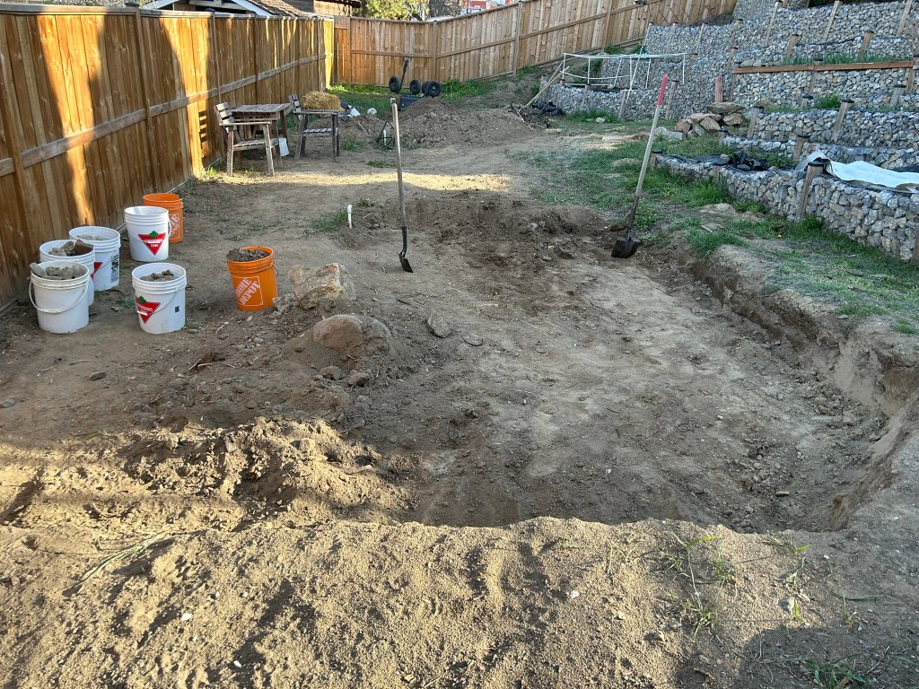 We have also realized that our area is going to continue getting warmer, and that for the temperatures we hit in the summer, we no longer want to hide out in our air conditioned house until the sun starts going behind the hills. Luckily, we have more space at the bottom of the yard that we originally anticipated, so we have decided to put in a small above-ground pool to enjoy in our hot desert summers, as well as a patio with gazebo so that we can read a book, or just hang out and enjoy the garden space.