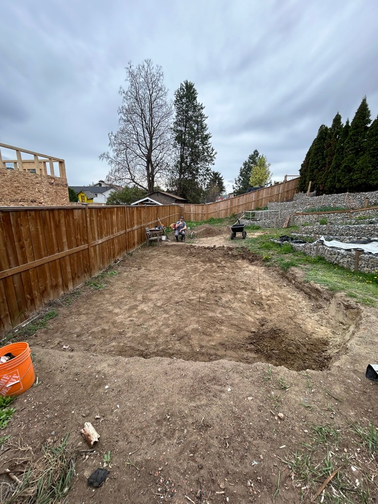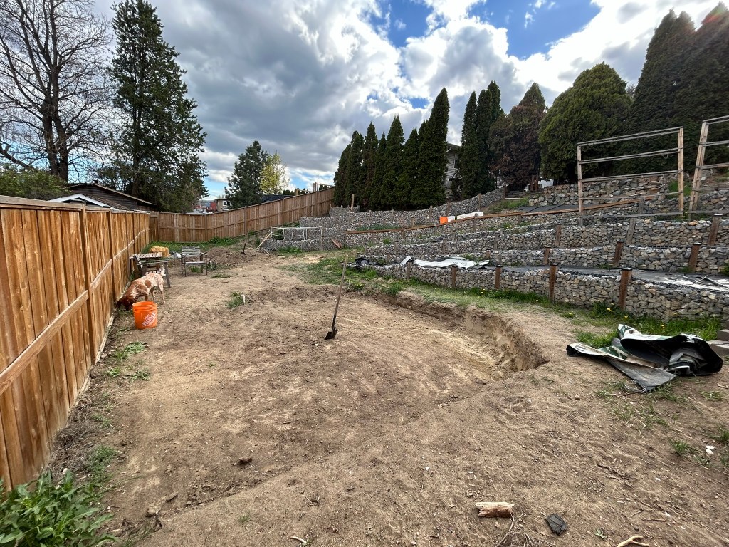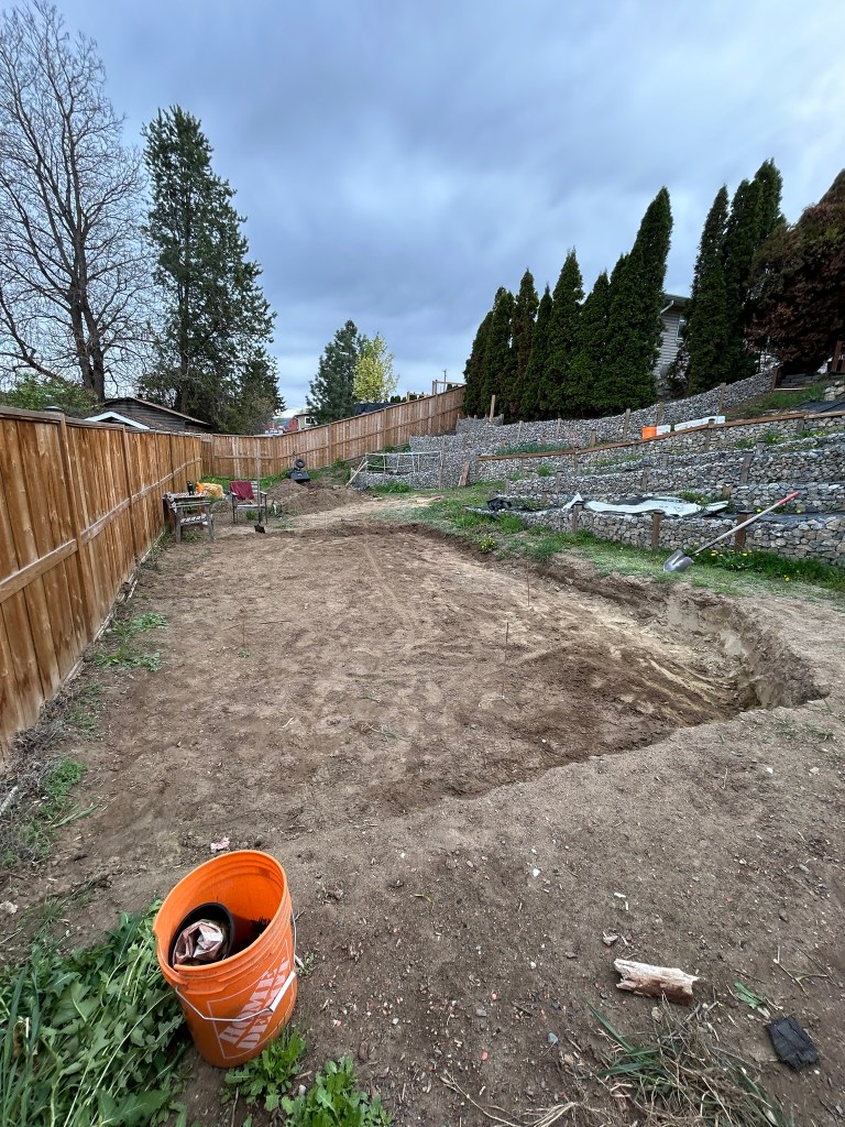 Our focus is the pool for now, because once that is in, we will be able to better work in some of the summer heat on the rest of the landscaping. We will push most of the remaining soil across the yard to finish leveling the whole area. We will dig in an area for a future floating deck and line that with landscaping fabric and crushed gravel for the summer. We will see how funds go for the summer. If all is well, then we may tackle putting in the raised deck as well.