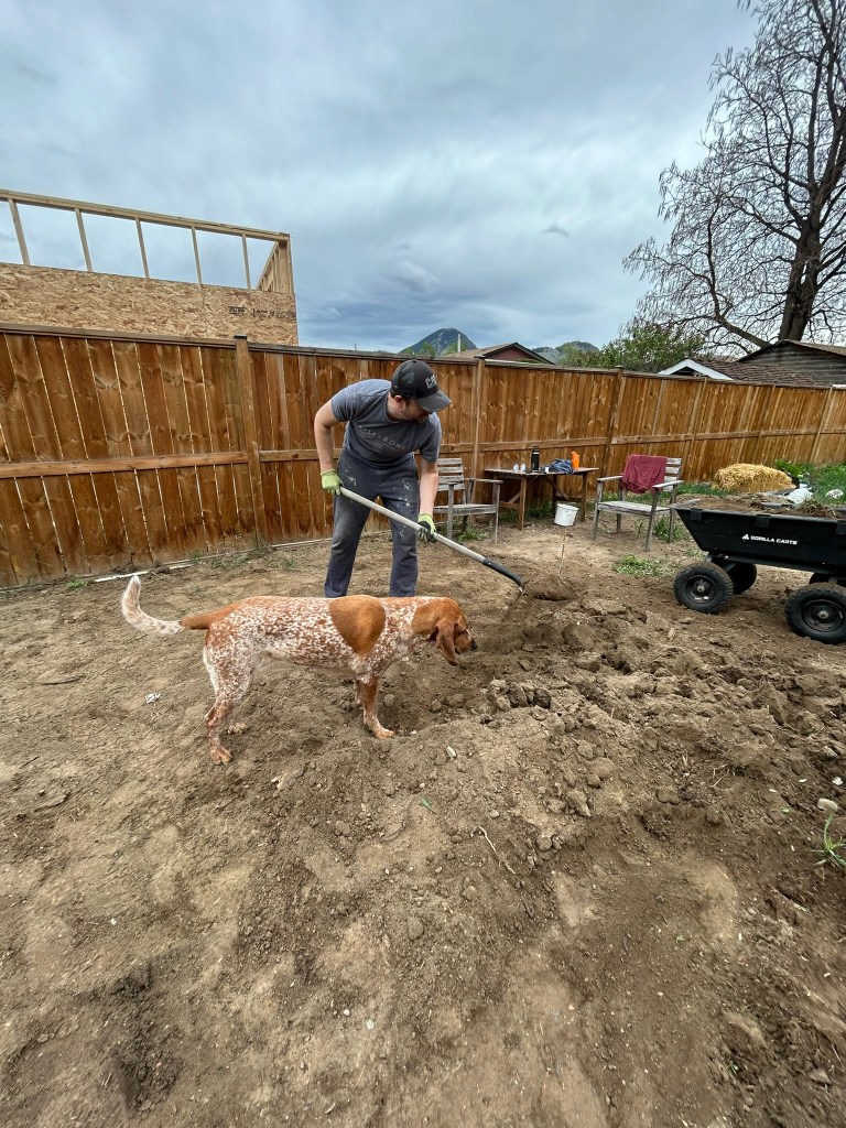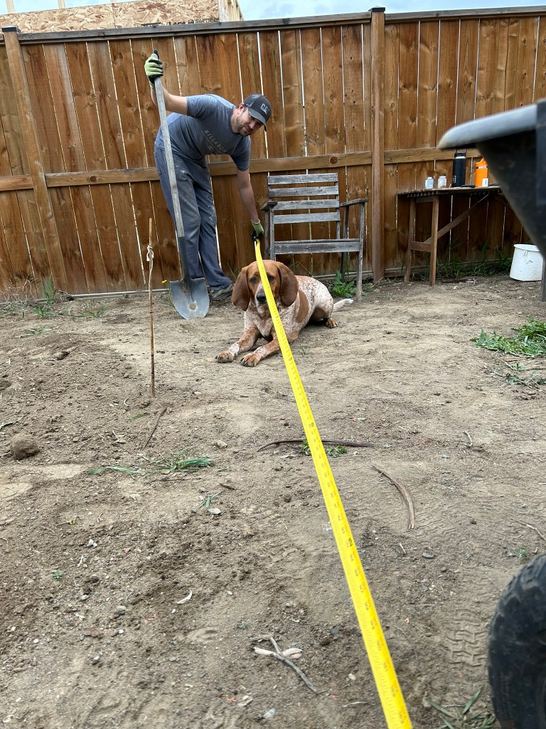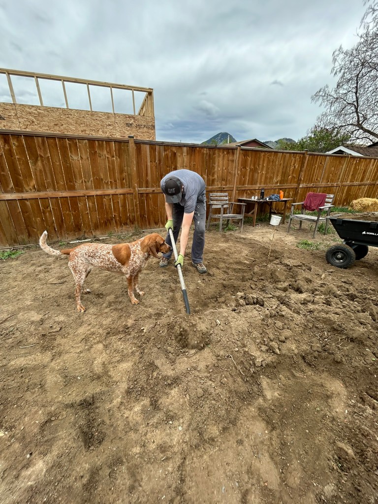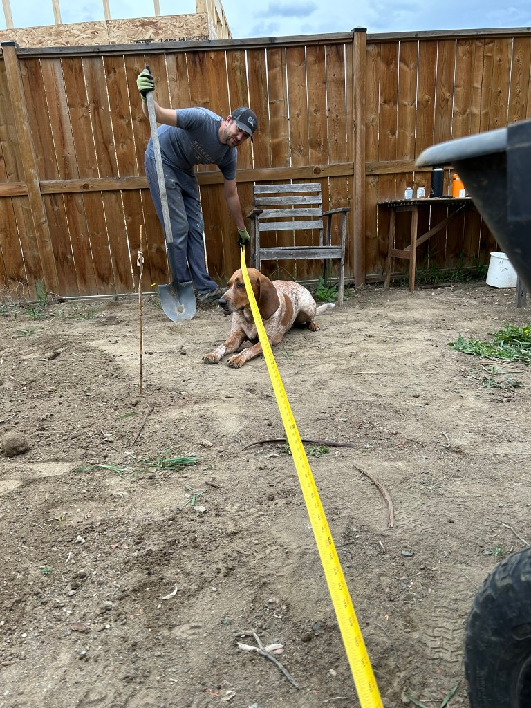 The bottom was fairly level, or so we thought. It didn’t feel like a big slope from the garden to the fence, but when we started digging it in…well, it told a much different story. In one area, we had to bring the level of the yard down by a couple of feet. So over the last 2 weeks, we have been moving around a lot of earth.