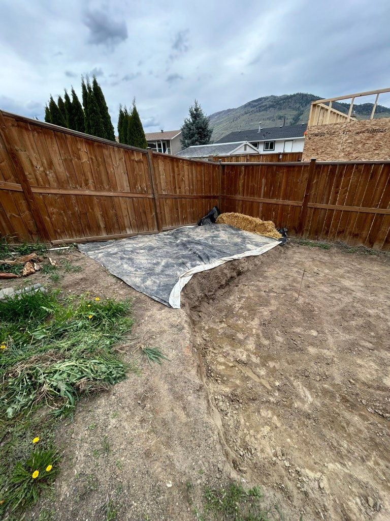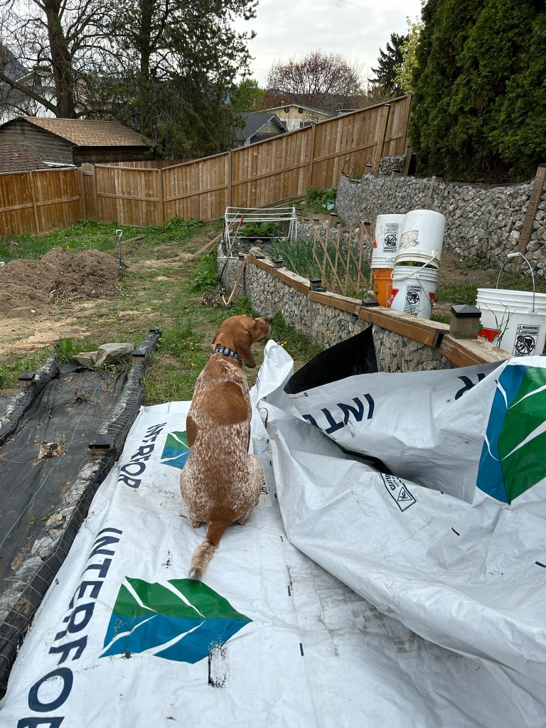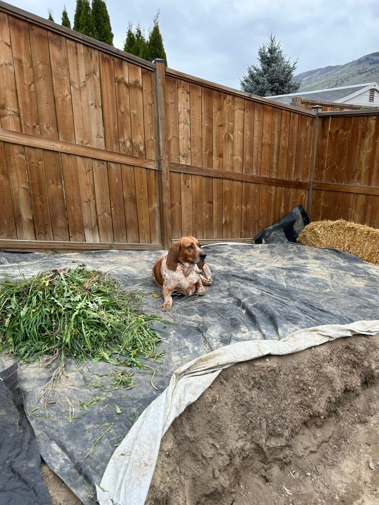 So a couple weeks ago, I laid lumber tarp paper down in that corner. I has left us a nice space to store our straw bale, and Basil loves it for the heat it gives off in the sun.