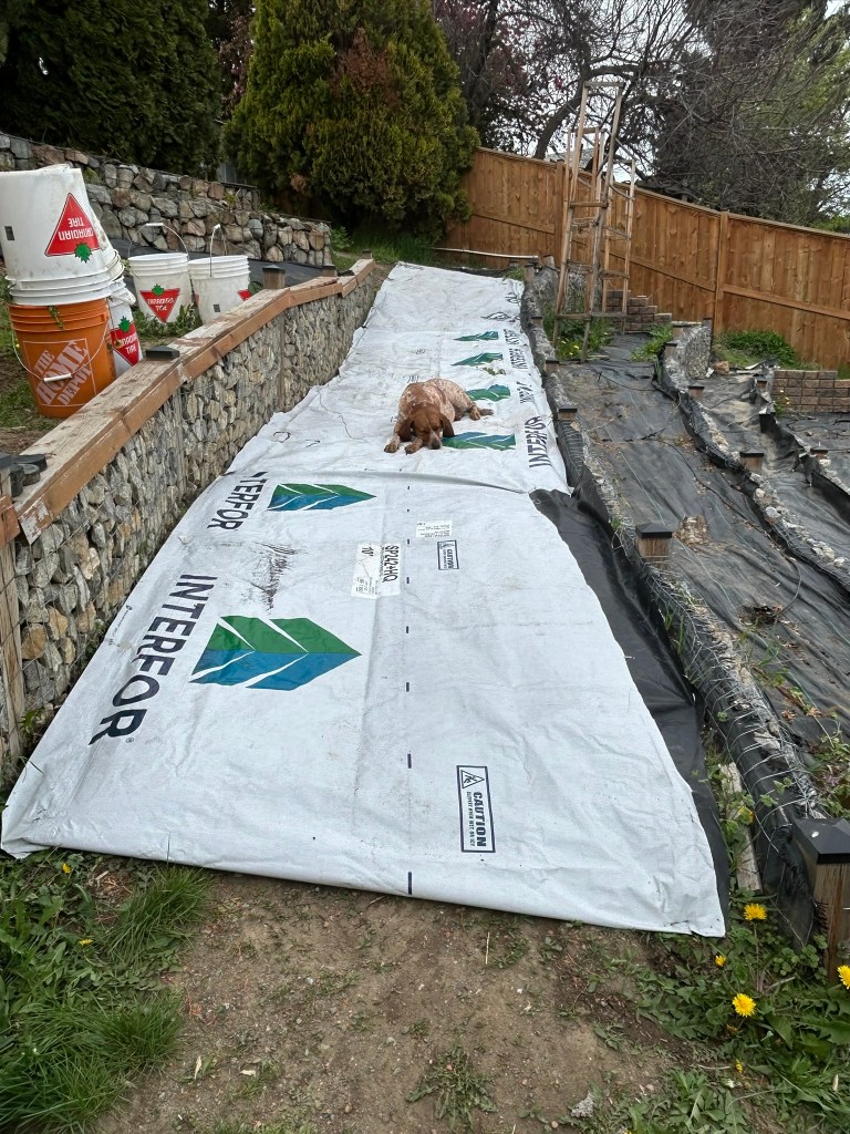 Using lumber tarp paper from the hardwood store, I covered 3/4 of the path. I unfortunately ran out before the very bottom portion, but majority of the path is now covered. We will leave this on for a few months and it will kill off anything that is under it. We can still walk on it and have been rolling our cart over it with no issues. There is a bit at the top by the cedar that will also need to be weeded and covered, though I believe we are going to try to finish the stackstone wall around that cedar this spring.