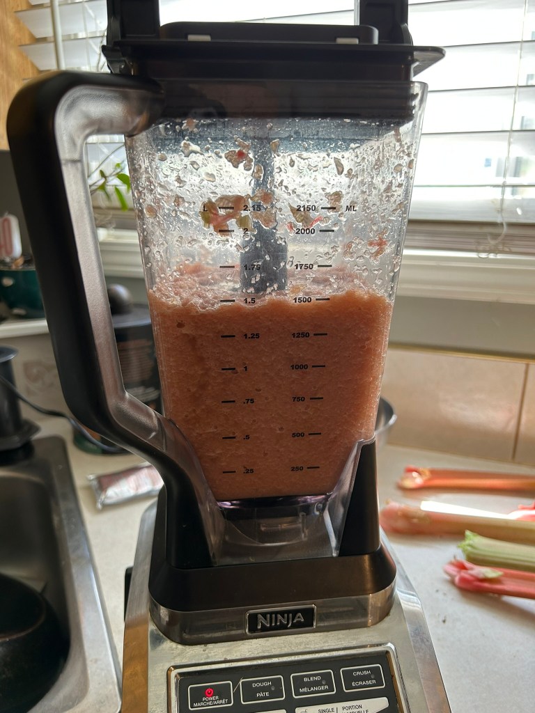 - Place the chopped rhubarb into a blender with 1/2 cup of water. Blend until you have a watery pulp with no chunks.