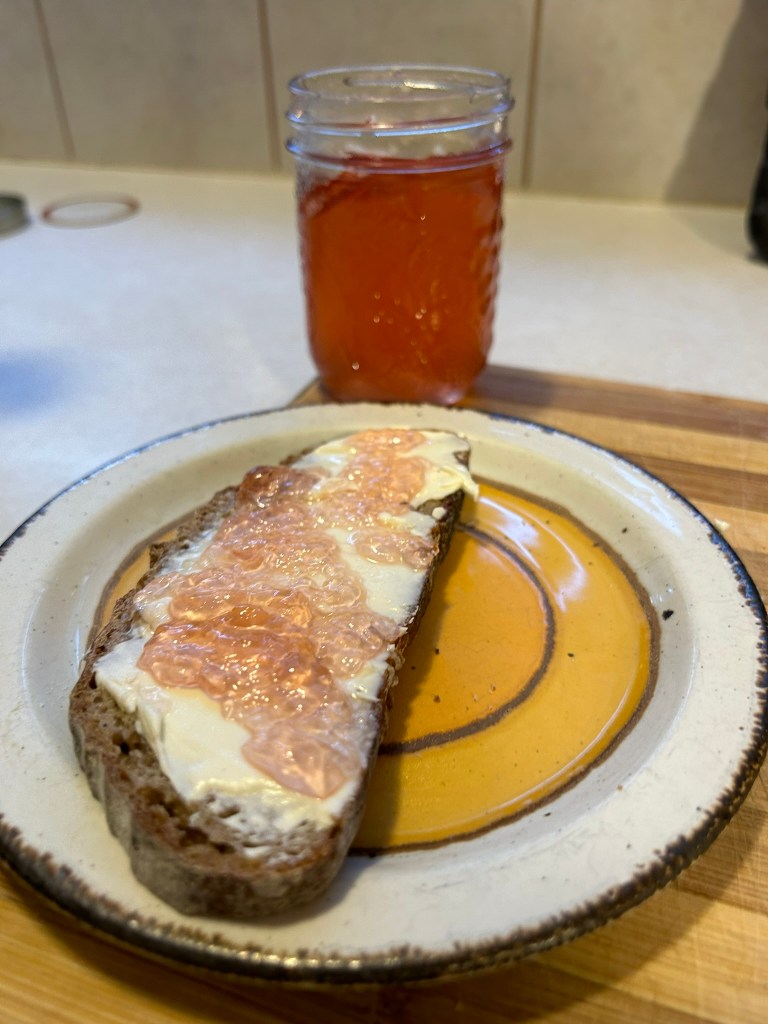 We had it on some homemade sourdough with a smear of cream cheese for the first try. Mm-mm-mm! I tried it the next day on some buttered sourdough bread, and it was just as good. I will try it next with some peanut butter. It is a bit of a delicate flavour so I don’t know if the peanut butter will overpower it.