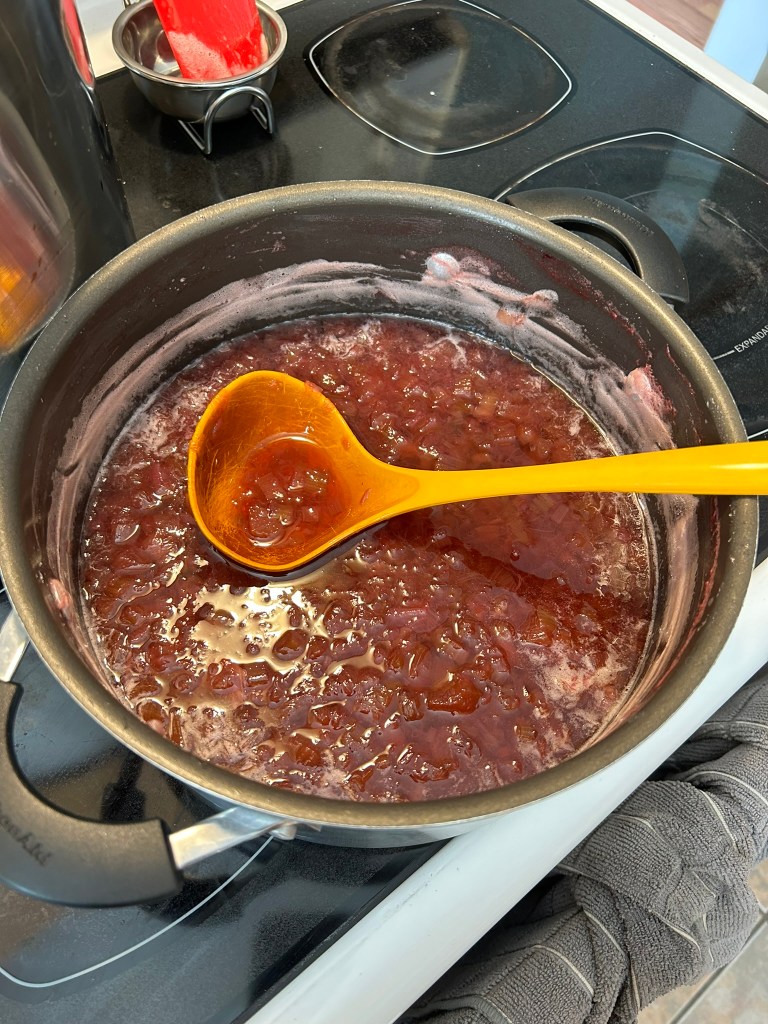 - At 10 minutes, add the pectin to the mixture and stir to combine. If you are wanting a firmer jam, consider using 2 packets of pectin. Bring the mixture back to a rolling boil for 5 minutes.