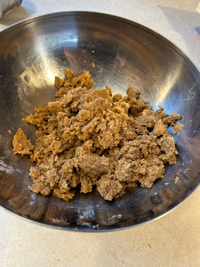 - In a separate bowl, place streusel ingredients together. Using your hands, or a pastry cutter, mix the items until the butter has spread evenly and you can loosely clump the streusel in your hand.