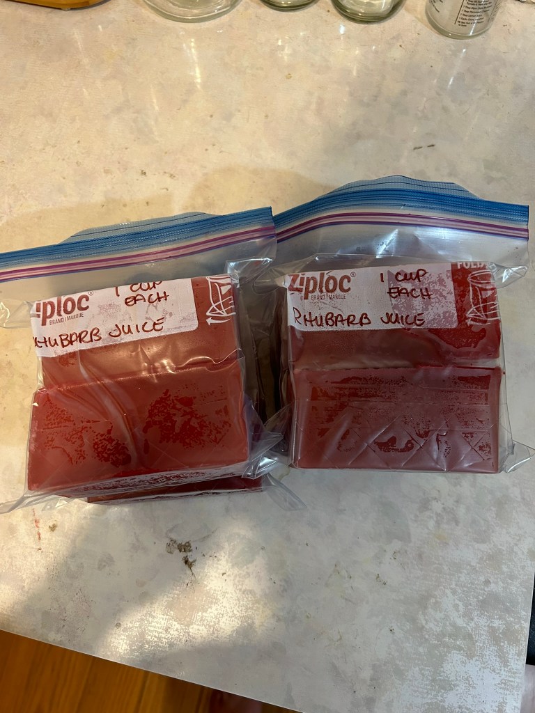 I have frozen little baggies of rhubarb in the past and then never used them throughout the winter. This year, I have found a rhubarb curd recipe that I love, and know I will want to make in the winter months, so I decided I can freeze the rhubarb juice so that I have it available whenever I want to make the curd.