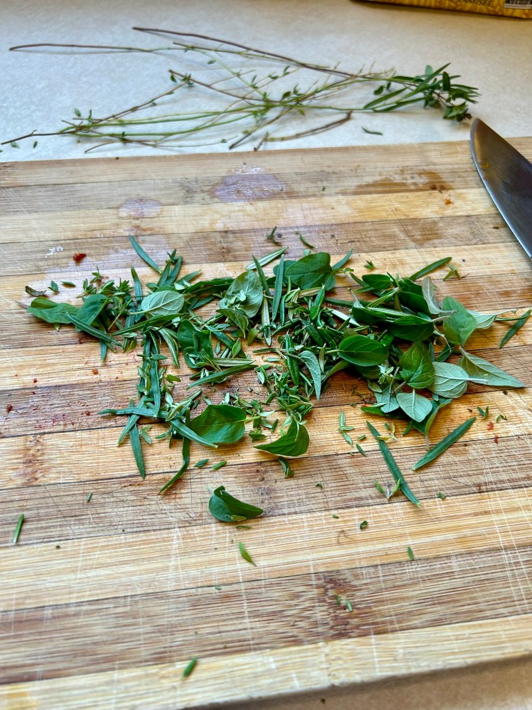 I used 2 g tarragon, 2 g rosemary, 2 g thyme, 2 g oregano & 2 g basil – all fresh cut from the garden - 4 gloves garlic