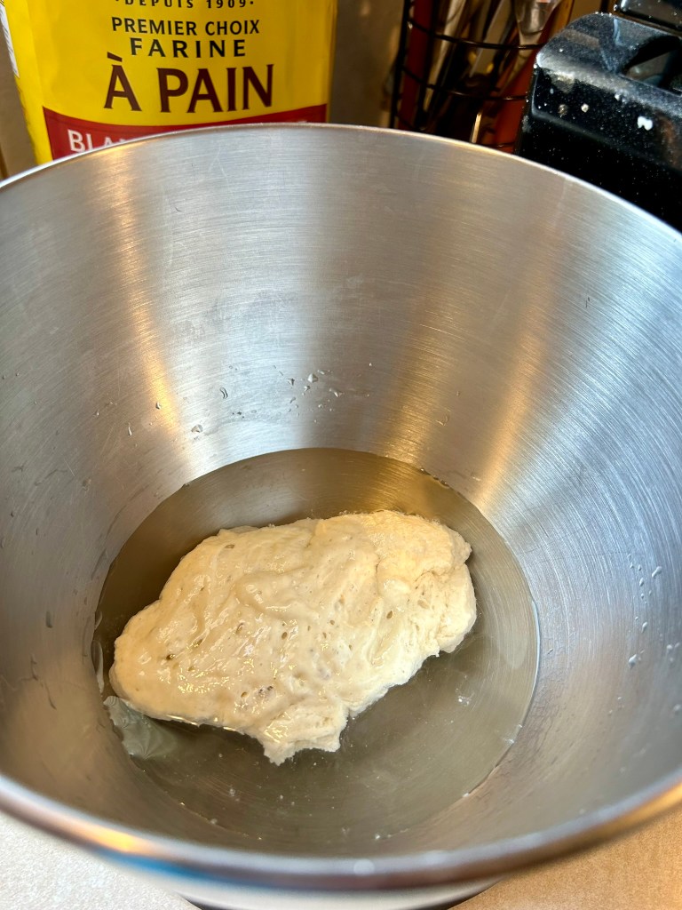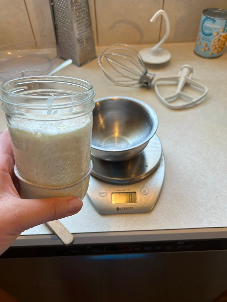 - 150 g of above noted fed starter, double or tripled in size