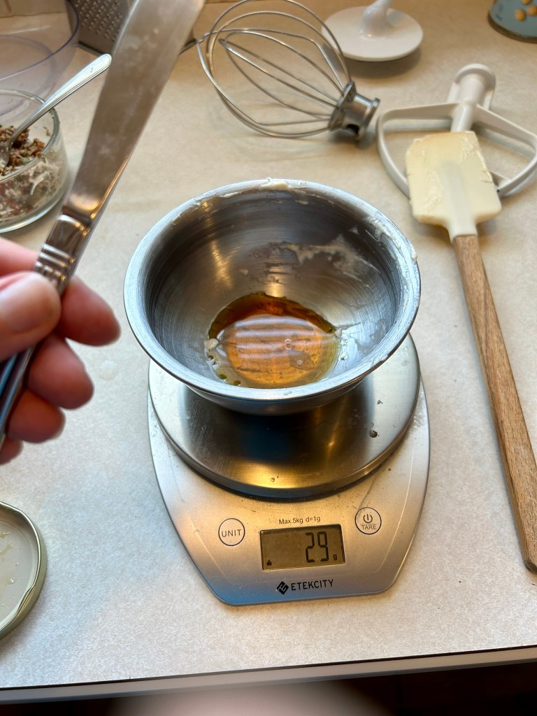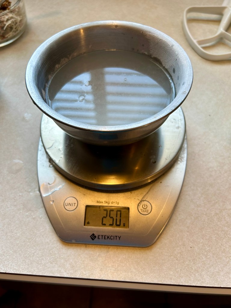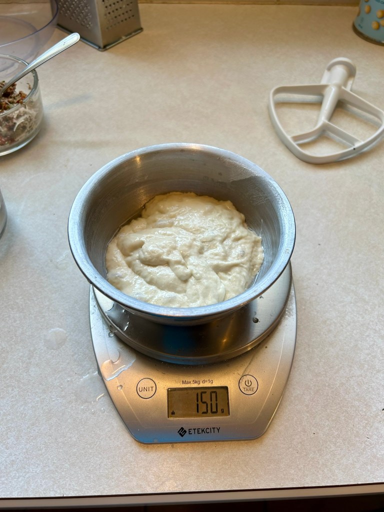 - Using a kitchen scale, weigh fed sourdough starter (150 g), water (250 g) and honey/maple syrup (28 g) to a stand mixing bowl and whisk until combined. If you don’t have a stand mixer, whisk by hand.