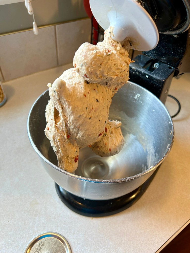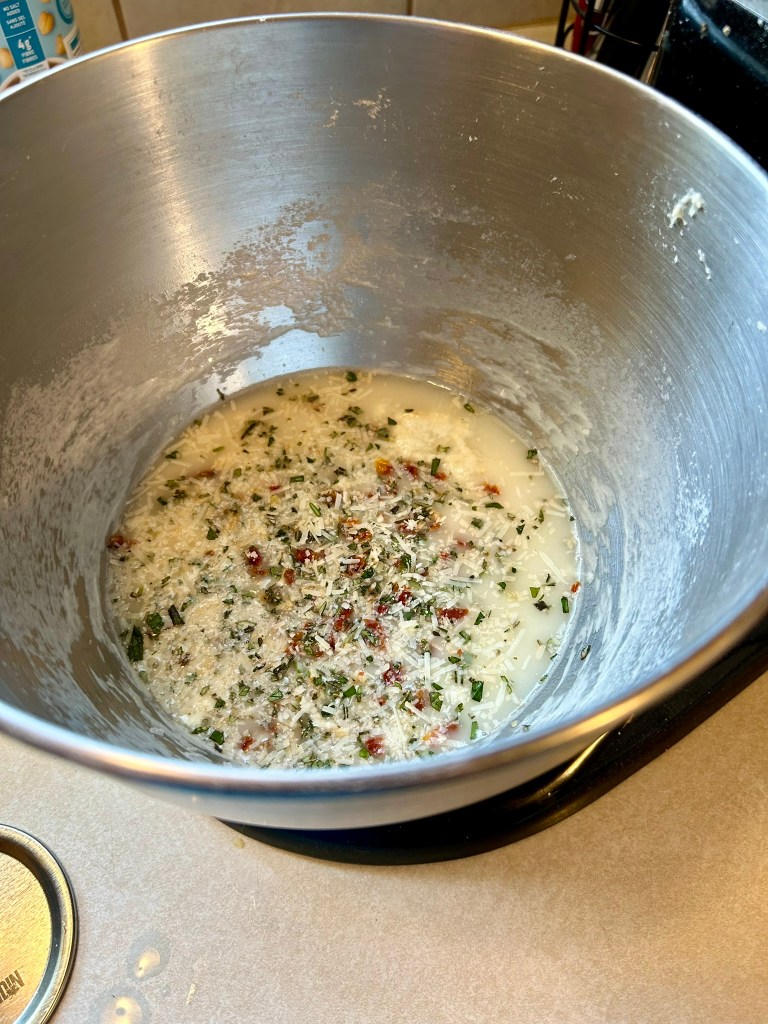 - Add bread flour (500 g), sea salt (10 g), sun-dried tomatoes (200 g), mixed herbs (10 g), garlic (4 cloves) & grated asiago (30 g) to the mixing bowl.
