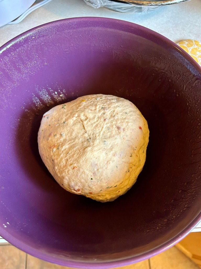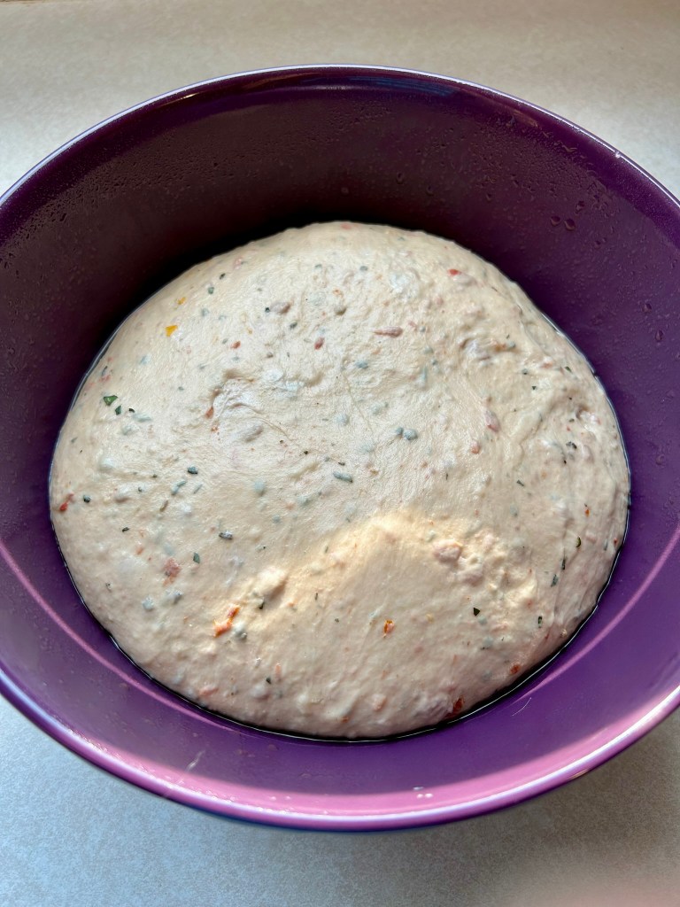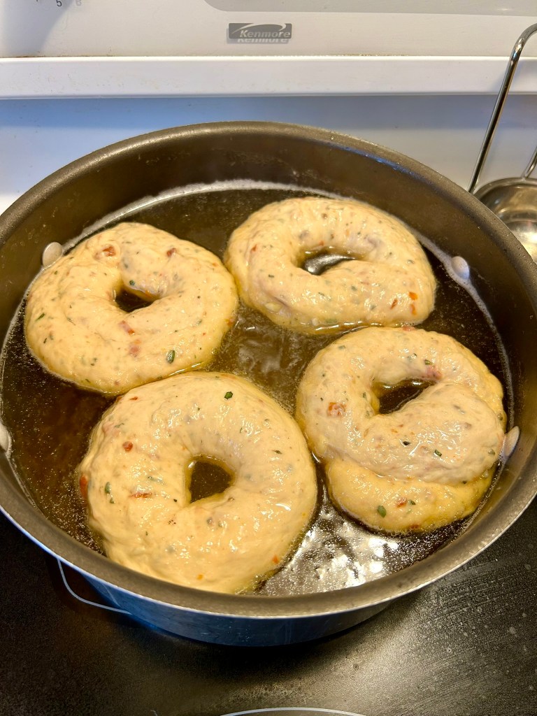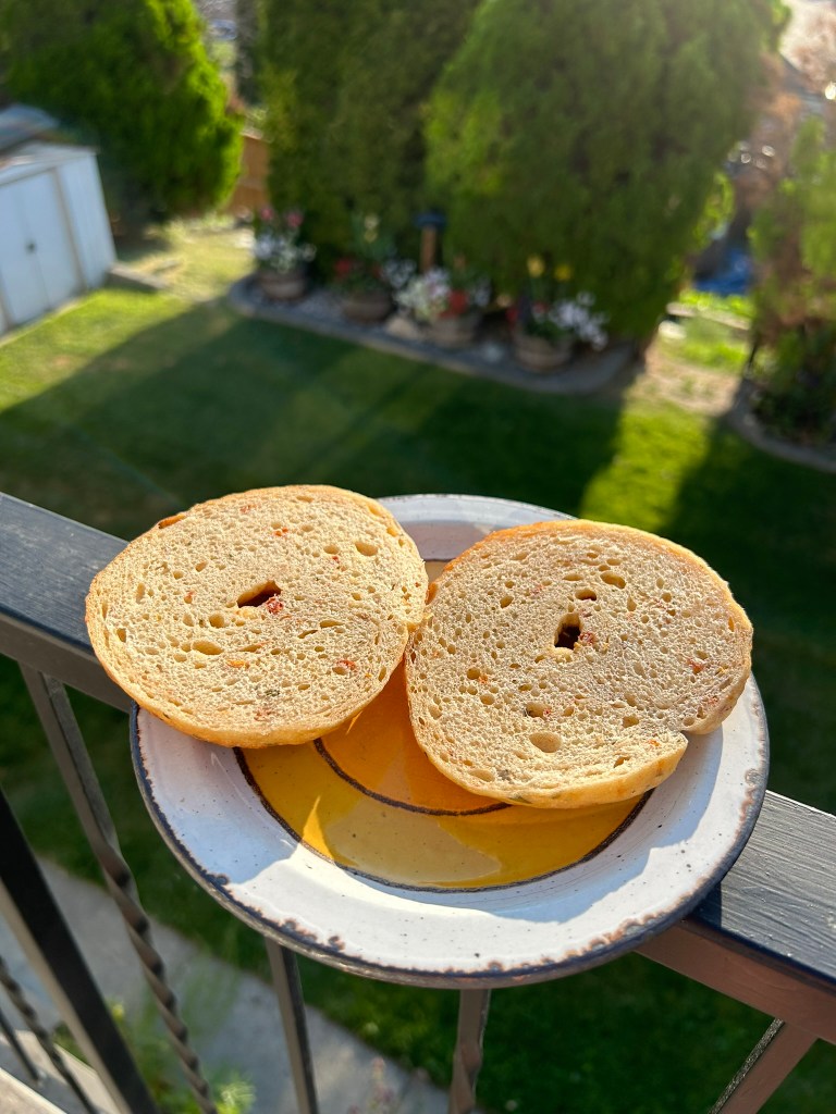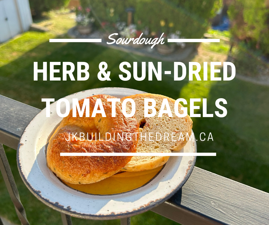 Sun-dried tomato and asiago bagels are one of my all-time favourite types of bagel. They are also one of the hardest to find. Many places carry them for a little while then phase them out, so it is so nice to finally have a recipe to make my own, with the bonus of being able to use a bunch of our garden goodies to make this especially flavourful.
