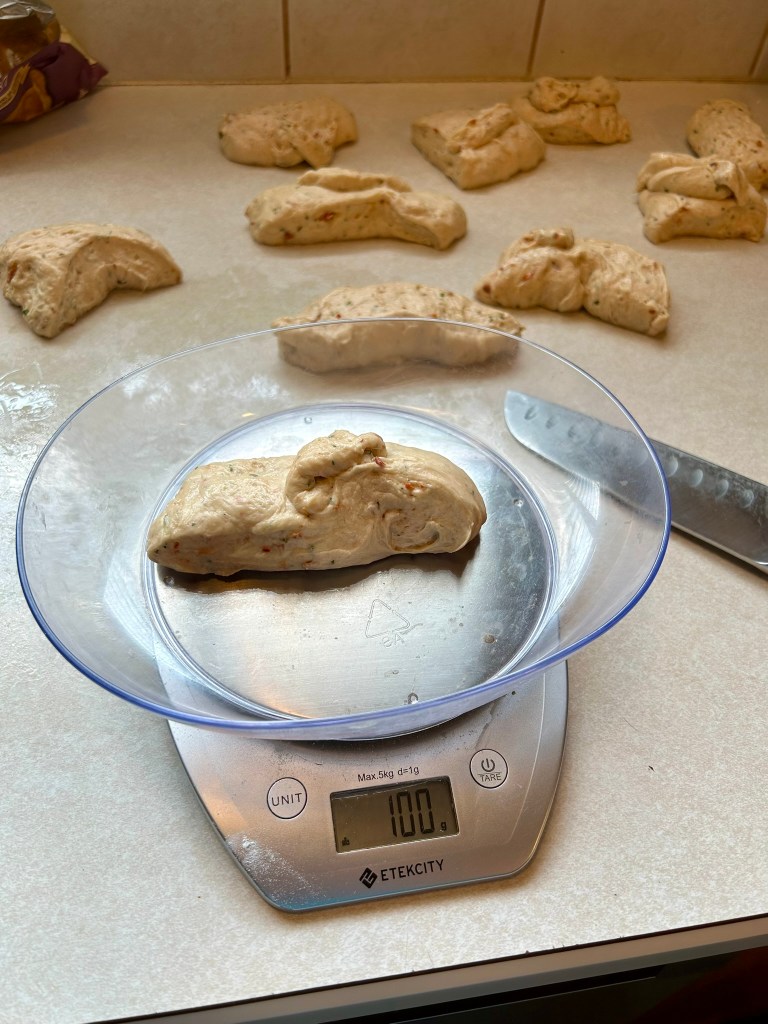 - Place the dough on a clean counter, without flour. Using a kitchen scale, weigh out 100 g portions. You can also eyeball it and cut your dough into roughly 10 roughly equal portions.