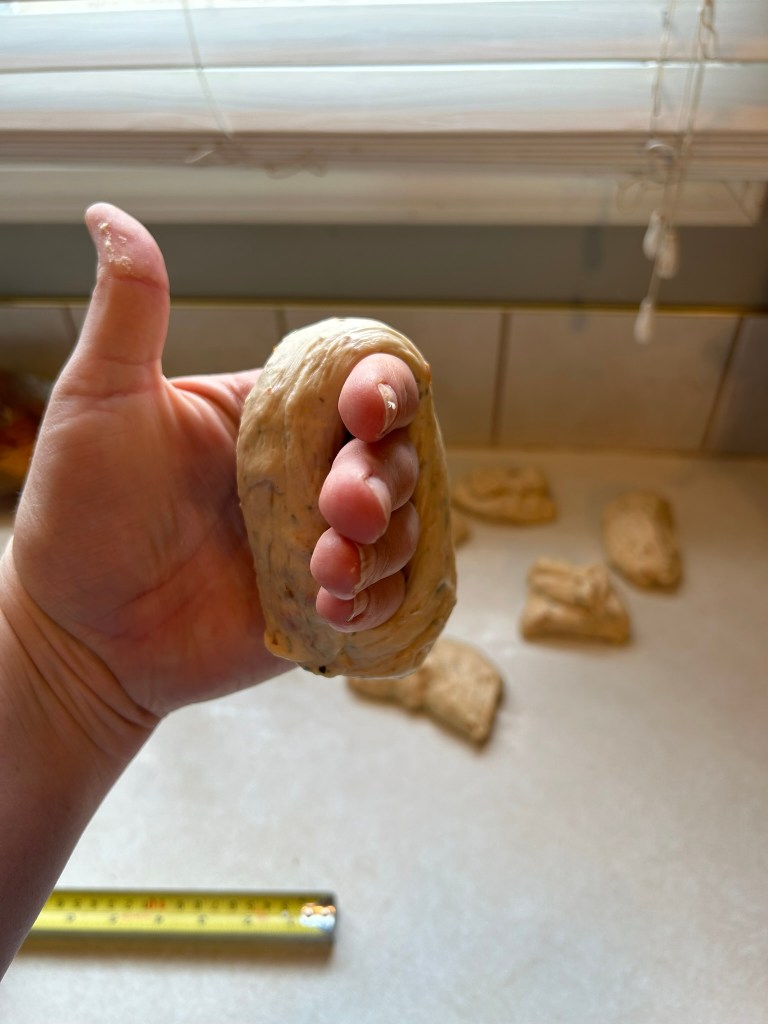 This batch was much fluffier, and soft compared to the last batch. I feel that the last batch got over-kneaded, making it a bit of a tougher, chewy consistency. I know that the water-bath can also affect the consistency, but I boiled this batch of bagels longer than the last ones, which would usually increase the chewiness, so I think it was the kneading from the original recipe that was the problem. I didn’t think the stretch and folds were necessary after the initial knead in the mixer.