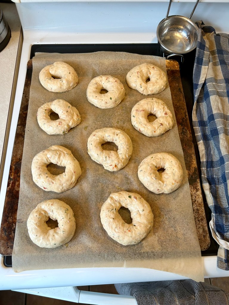 - Once all the bagels have gone through the water bath, re-arrange as necessary on the baking sheet for baking. They will not puff further, so a lot of space is not needed, but it is ideal if they are not touching.